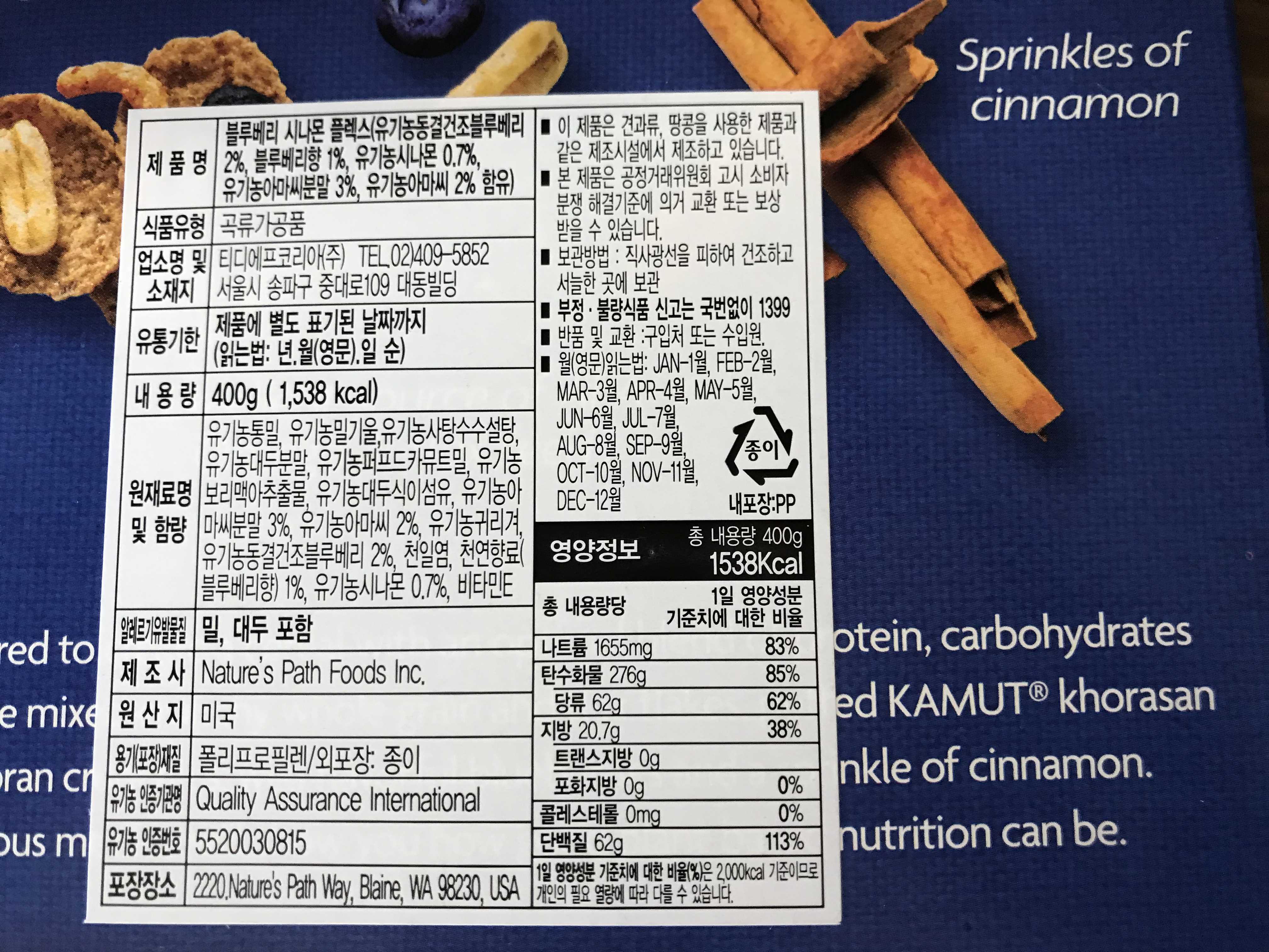 뭔가 카카오가 함유된것 맨키로 연갈빛의 통밀느낌이 낭낭하네요~ 시나몬향이 은은하고 생각보다 약하네요...블루베리도 기대이상으로 적게 들어있구요, 대부분이 플레이크로 이루어져 있었어요