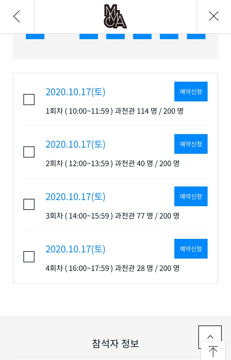 원하는 회차를 고르셨으면 맨 우측의 예약신청을 클릭 하시고 스크롤을 내려 참석자 정보를 입력해 주세요