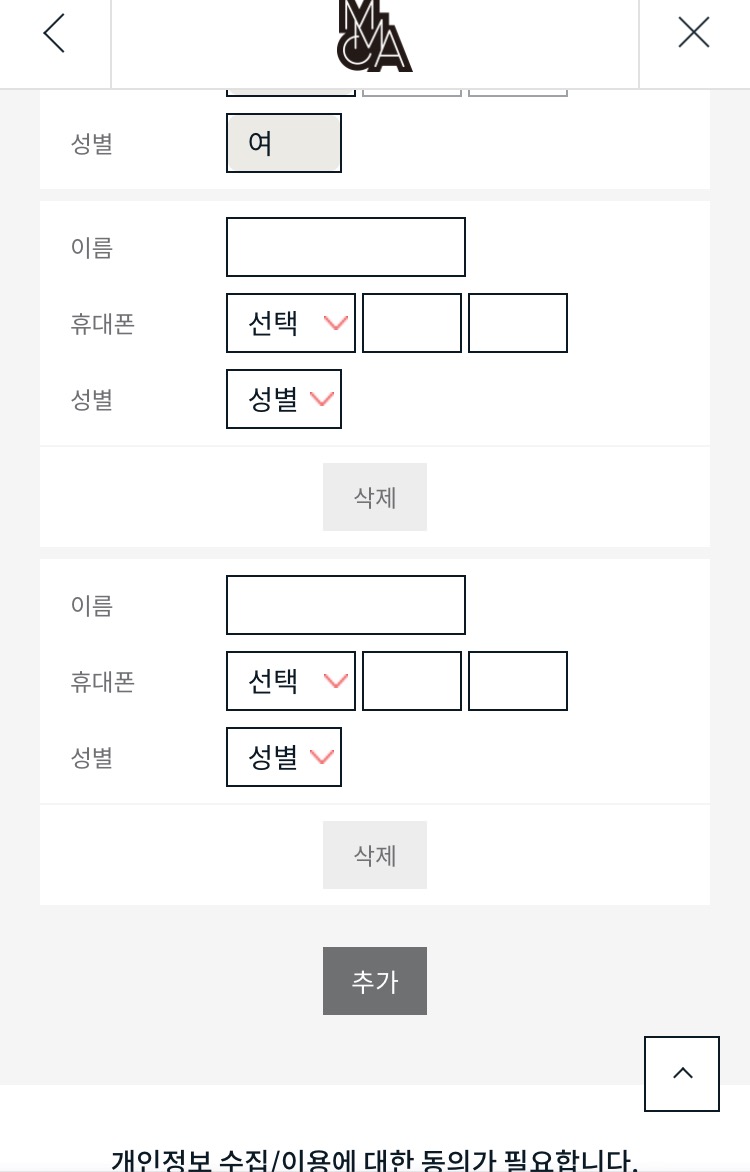 원하는 명수만큼 추가를 누르셔서 이름 전화번호 성별을 입력하신 뒤 스크롤을 내려서 주세요