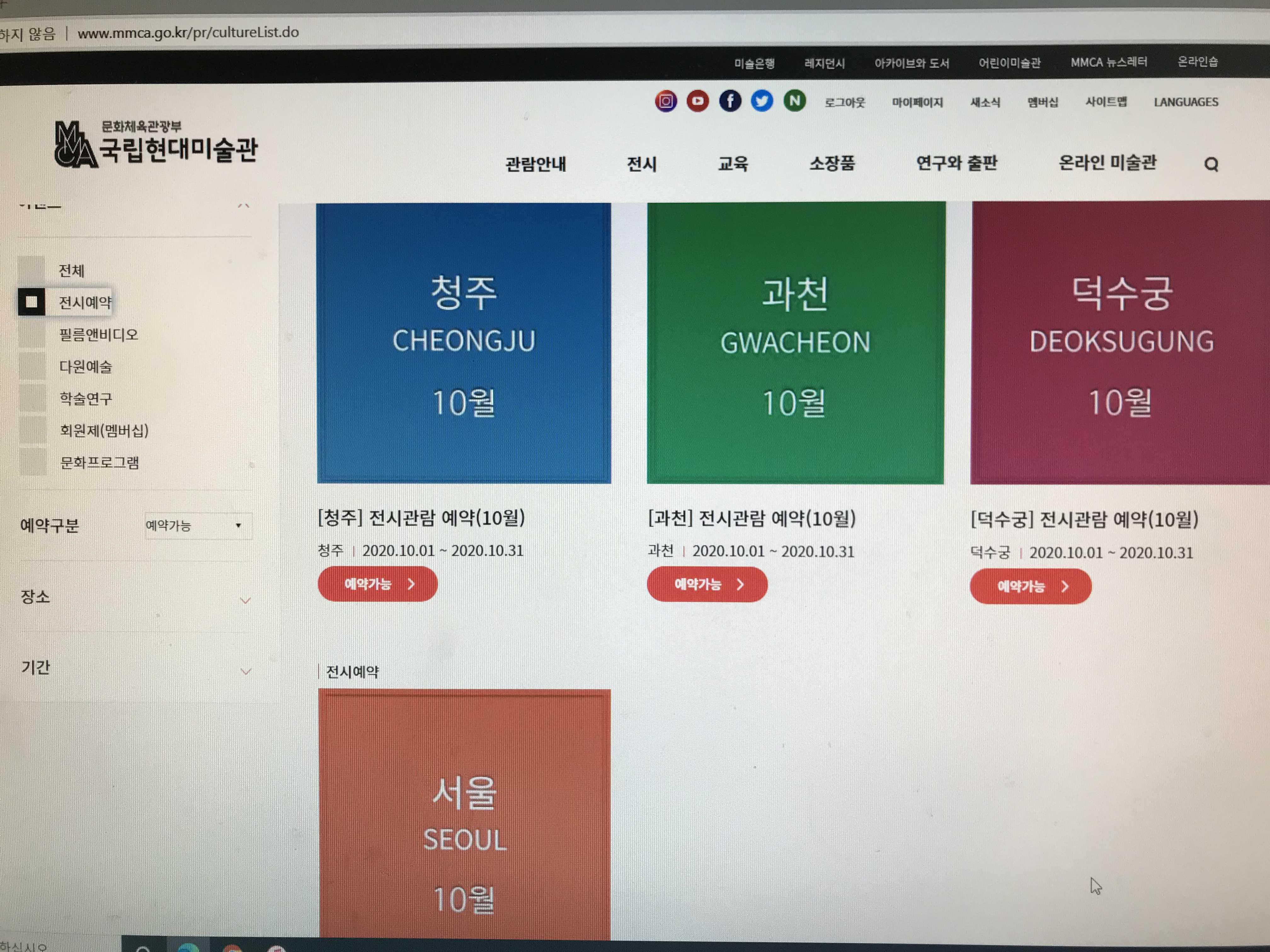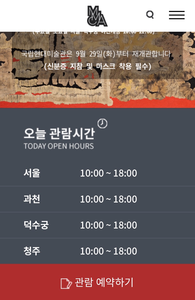 하단의 빨갛게 표시된 관람 예약하기를 클릭 하시면 과천 청주 덕수궁 서울 네곳의 전시를 선택해