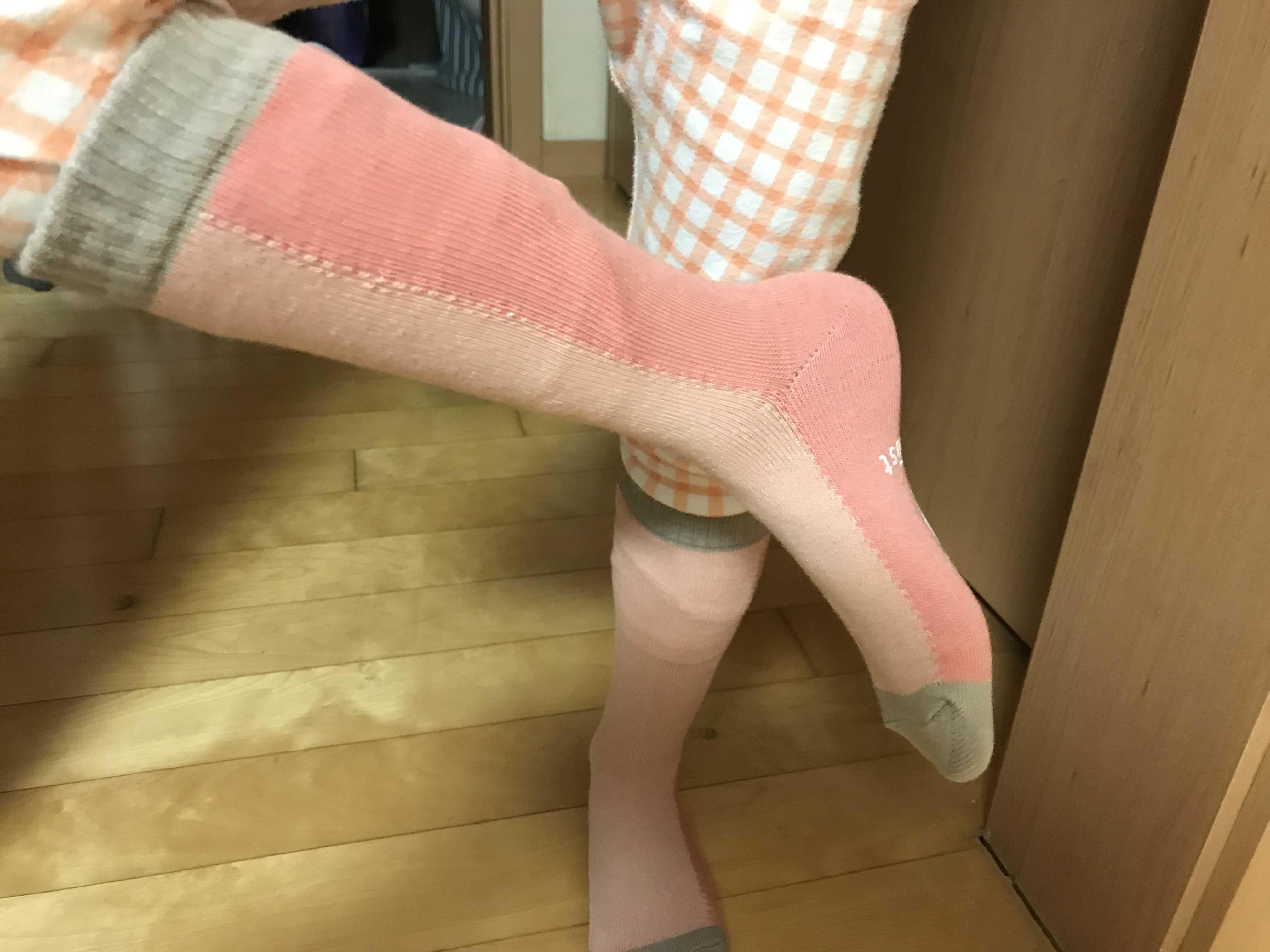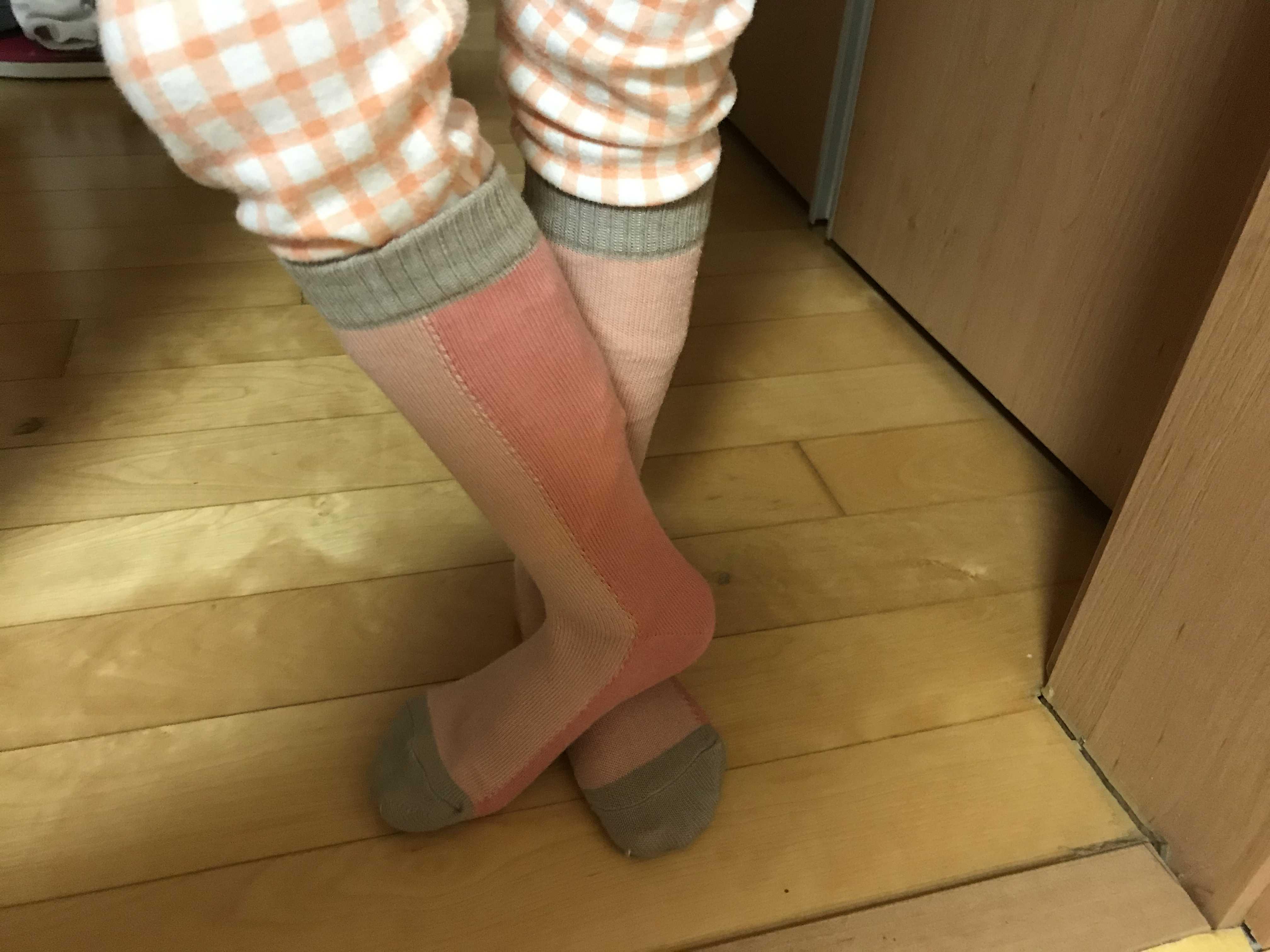 원톤의 단조로운 핑크색상이 아니라 연한 피치핑크와 인디핑크가 반반으로 컬러매칭이 되있어서 색상 조합이 너어무 예뻐요!! 그리고 발목이 길어서 한껏 끌어올리면 반장양말 느낌이 좀 나는데요~ 날씨가 쌀쌀해지는 가을 겨울에는 목짧은 양말보다는 요런 양말이 바지속에 받쳐 신기도 좋고 또 치마 입을때도 좀 긴 양말이