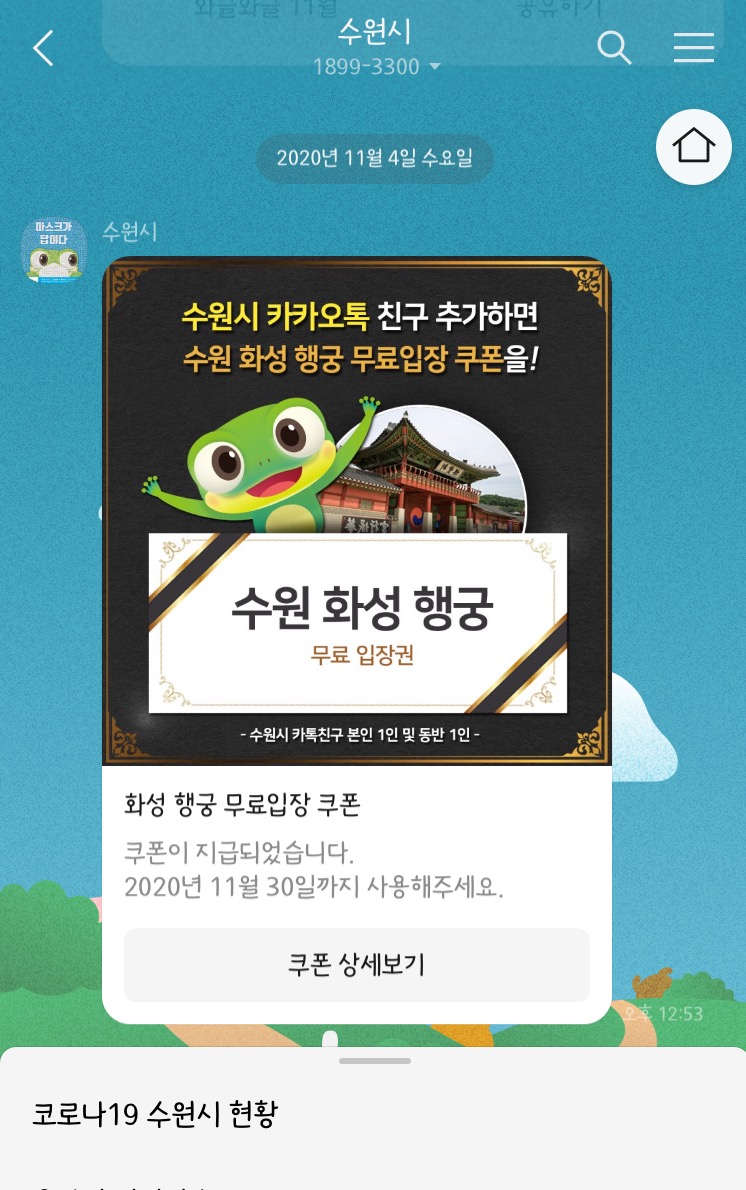 작년 9월쯤 숭이와 함께 가본뒤로는 올해는 여태껏 가지 못한 상황이였거든요~ 포스팅을 올리고 나서 저도 수원시와 카카오톡 플러스 친구를 맺고 무료 쿠폰을 받아서 엊그제 화성행궁을 다녀왔답니다^^