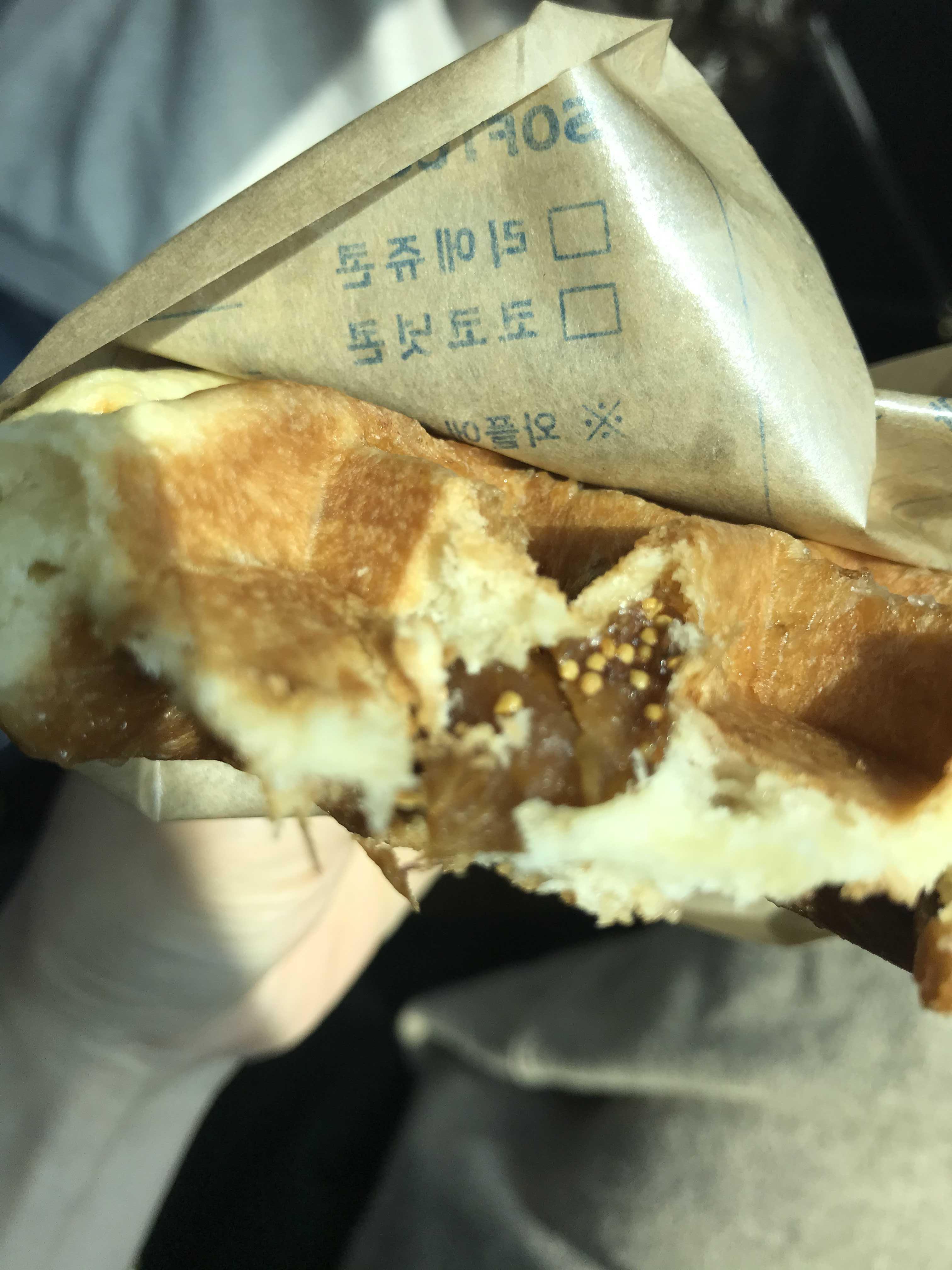 다음으로 소개해드릴 와플은 무화과 와플이예요~ 무화과 좋아하시나요? 전 좋아합니다만은ㅎㅎ 요건 사실 호불호가 갈릴 수도 있을것 같지만 대단히 고급진 달달함에 소개해드려봐요~ 무화과잼을 넣어 만든 무화과 와플은 애플시나몬 보다는 약간 덜 달지만 무화과가 주는 풍미가 또 다르거든요~ 아주 고급지게 달큰하니 맛있어요~