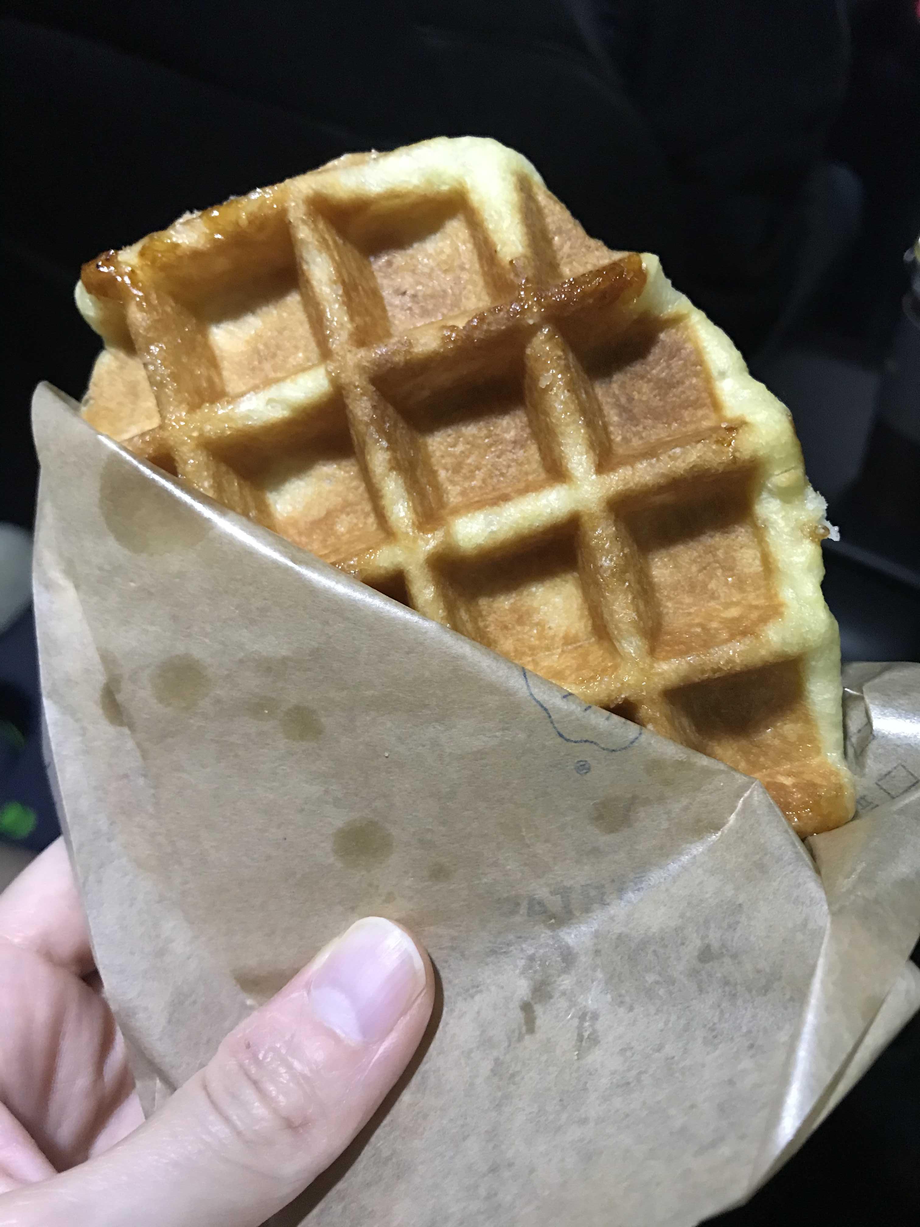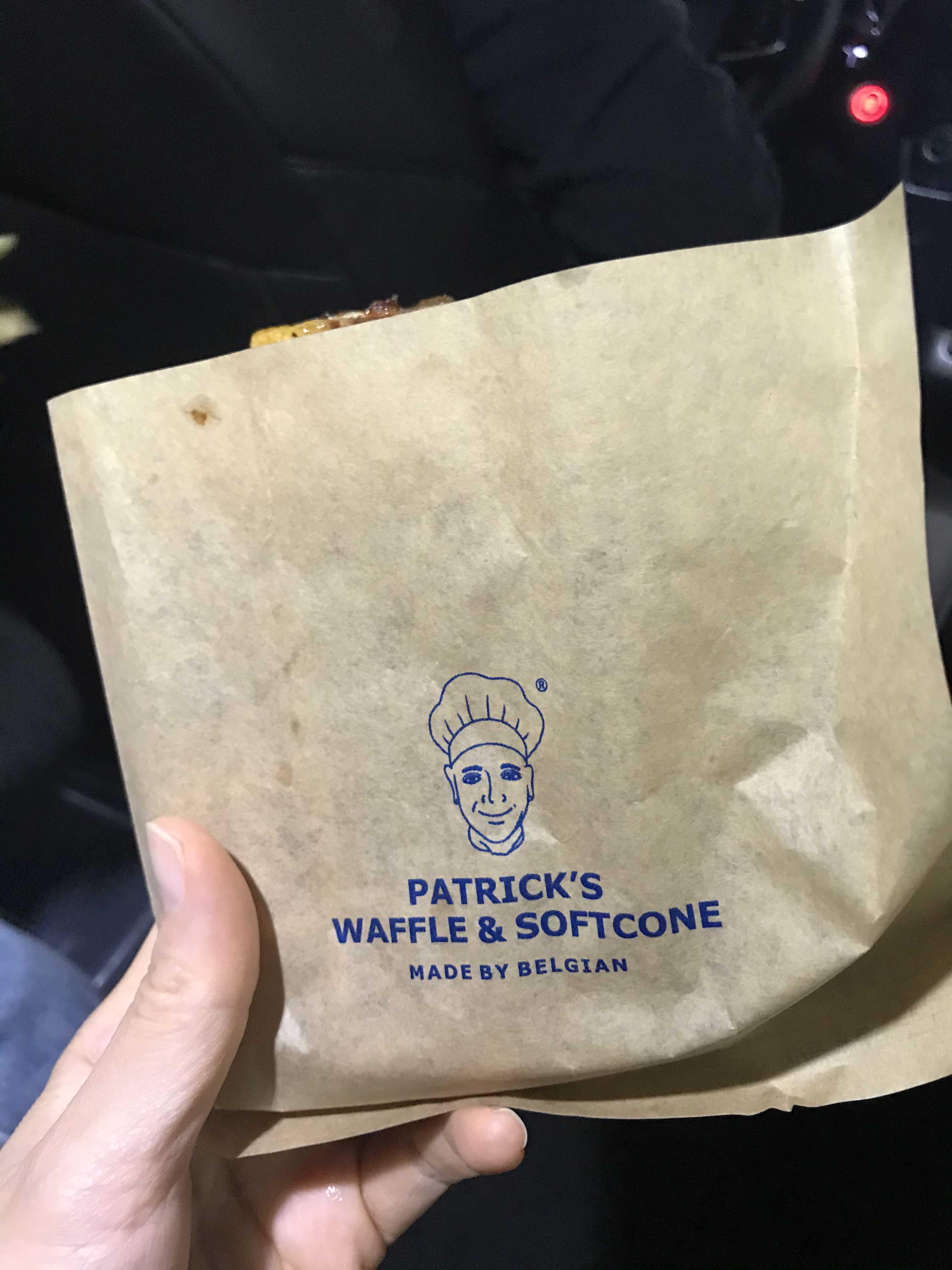 세가지맛 모두 포장을 해와서 차에서 먹어보기로 했어요~ 와플을 담은 봉투겉면에 그려진 캐리커쳐가 와플을 만드신 장본인 패트릭의 모습이겠죠?