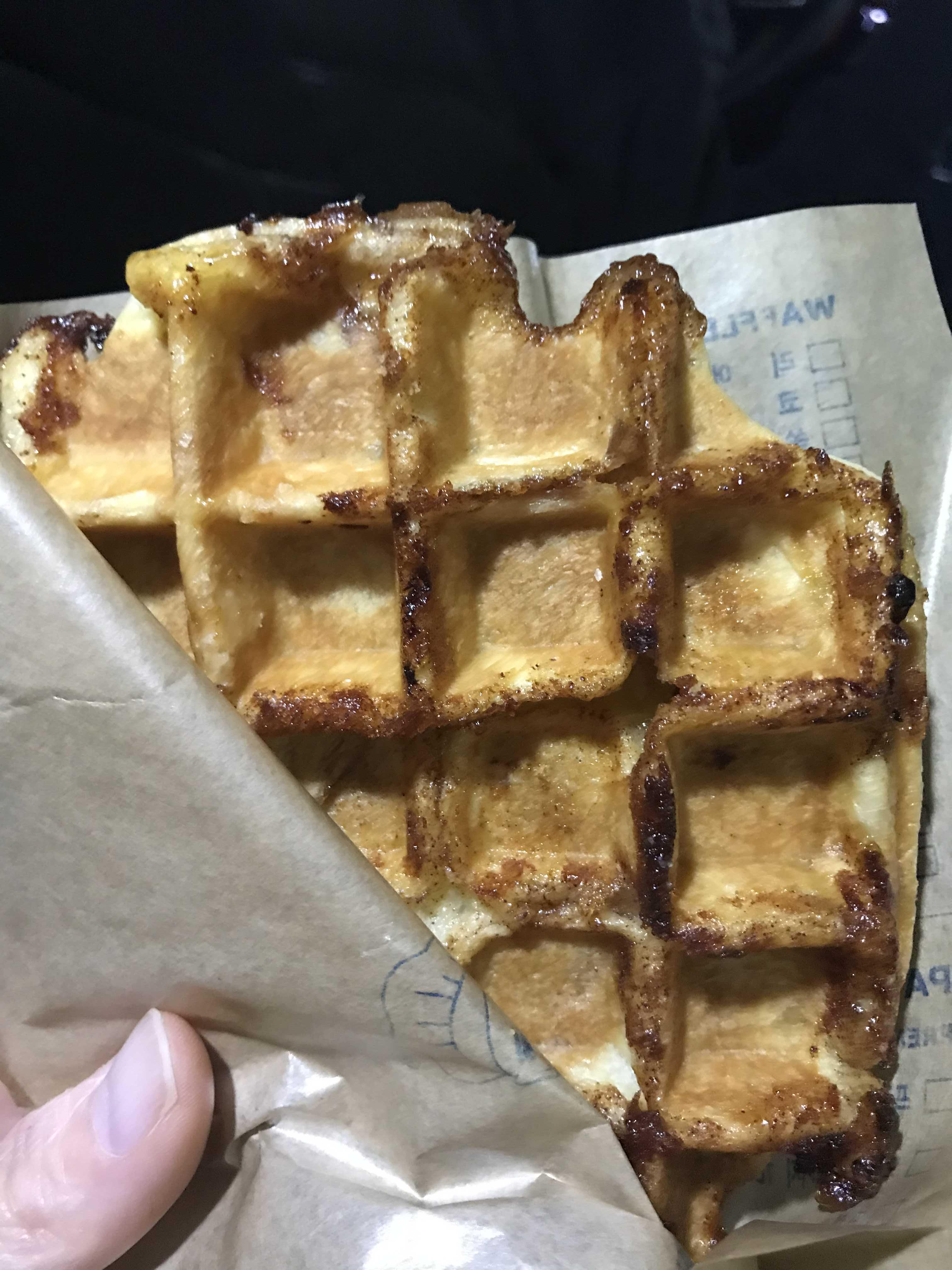 그리고 이건 제가 이집에서 제일 좋아하는 저의 넘버원 페이보릿 와플 애플 시나몬이예요~ 처음 보여드린 깔끔했던 리에주 와플과는 다르게 겉면에 무언가 덕지 덕지 붙어있는게 보이시죠?