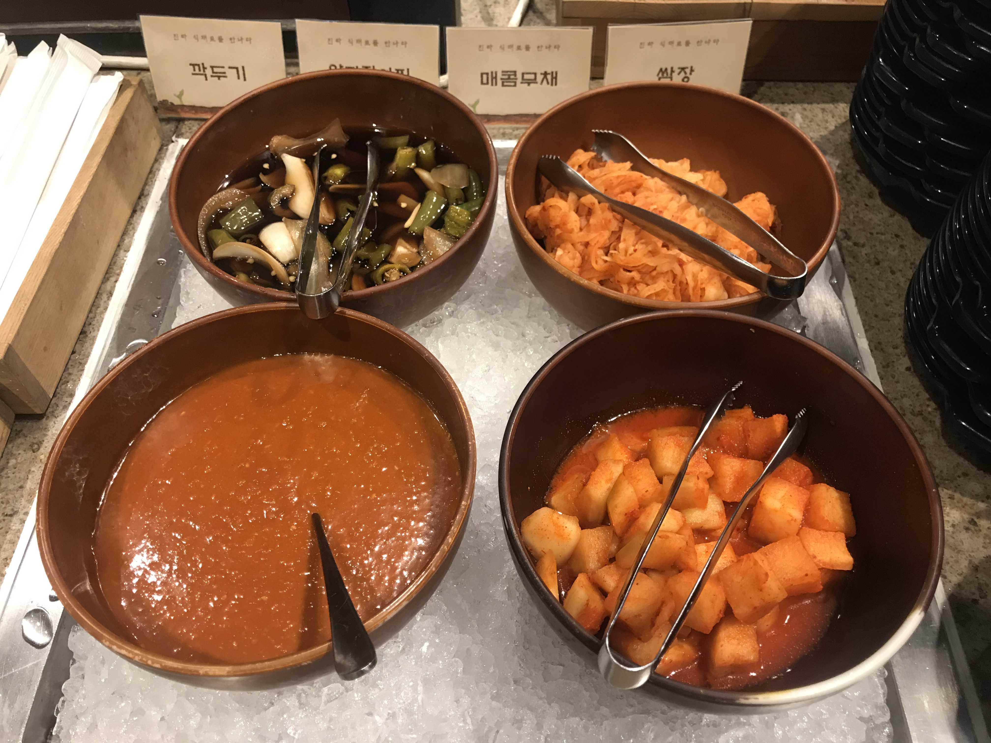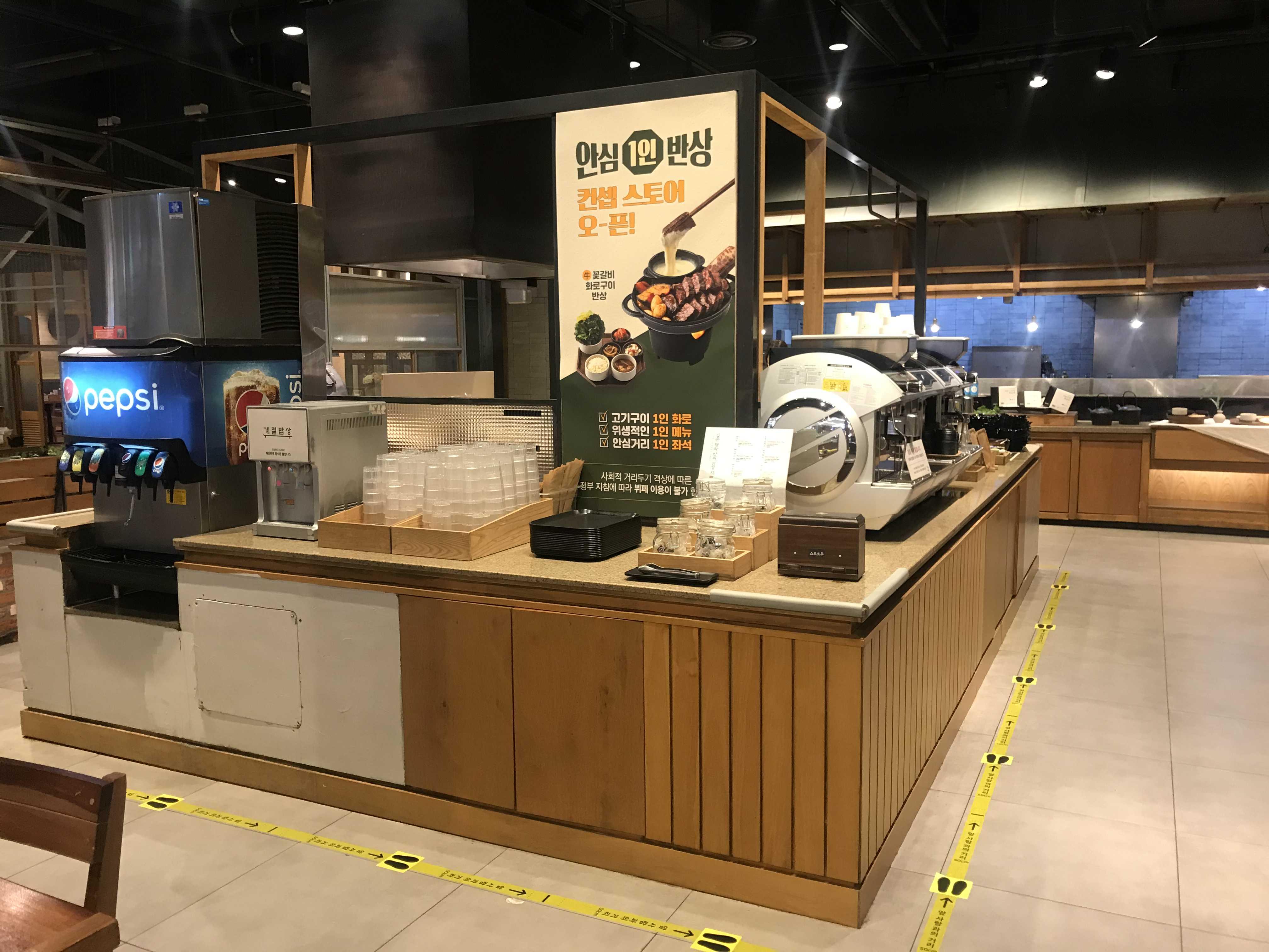 매장 한켠에 노란색 테이프로 표시된 부스가 밑반찬을 자유롭게 리필해 먹을 수 있는 셀프바예요~