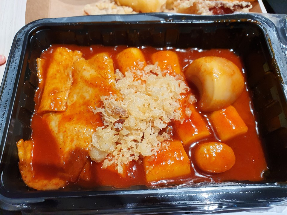 떡볶이는 어묵과 특이하게도 구운계란이 함께 나오고 튀김가루가 고명으로 얹어져 나오네요^^