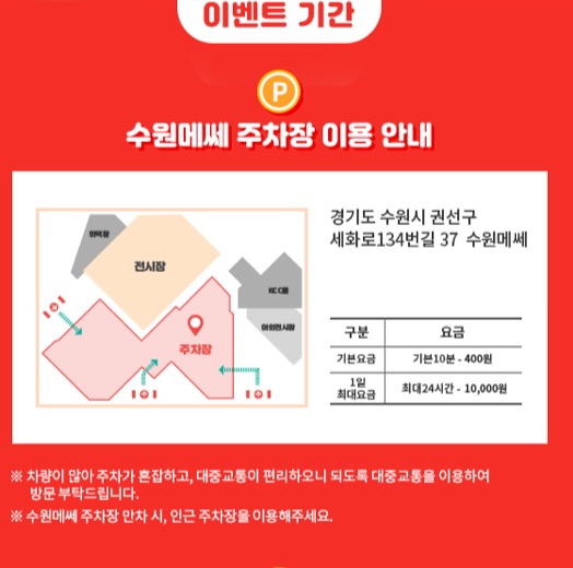 메쎄 주차장이 만차일경우 차선책으로 생각해 볼 수 있는 인근 주차장으로는 롯데몰 주차장과 수원역 환승센터 주차장이 있긴하지만 요금이 부과되니까 참고 하셔서 주차하시면 좋을것 같네요~