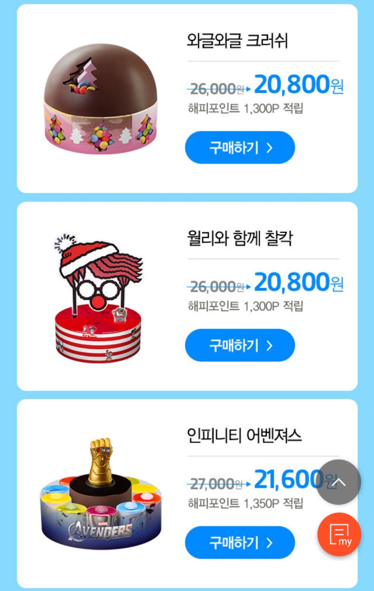 여아들이 좋아할법한 엘사 케이크와 크리스마스 느낌 가득한 트리모양 케이크와 크리스마스 버전 와츄원도 있네요ㅎ