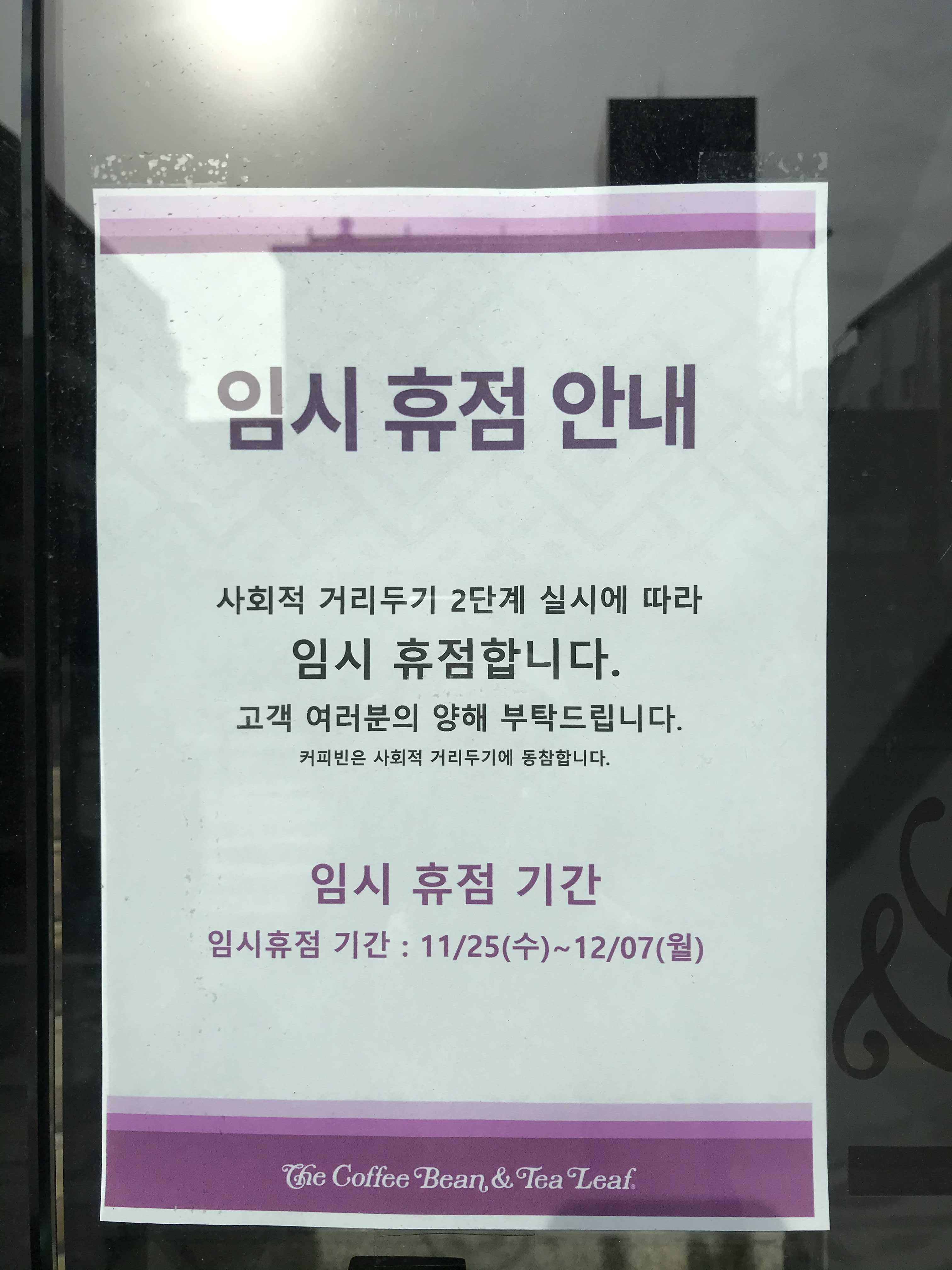 사회적 거리두기 2단계로 인해서 모든 커피빈 매장이 영업을 하는건 아니더라구요?