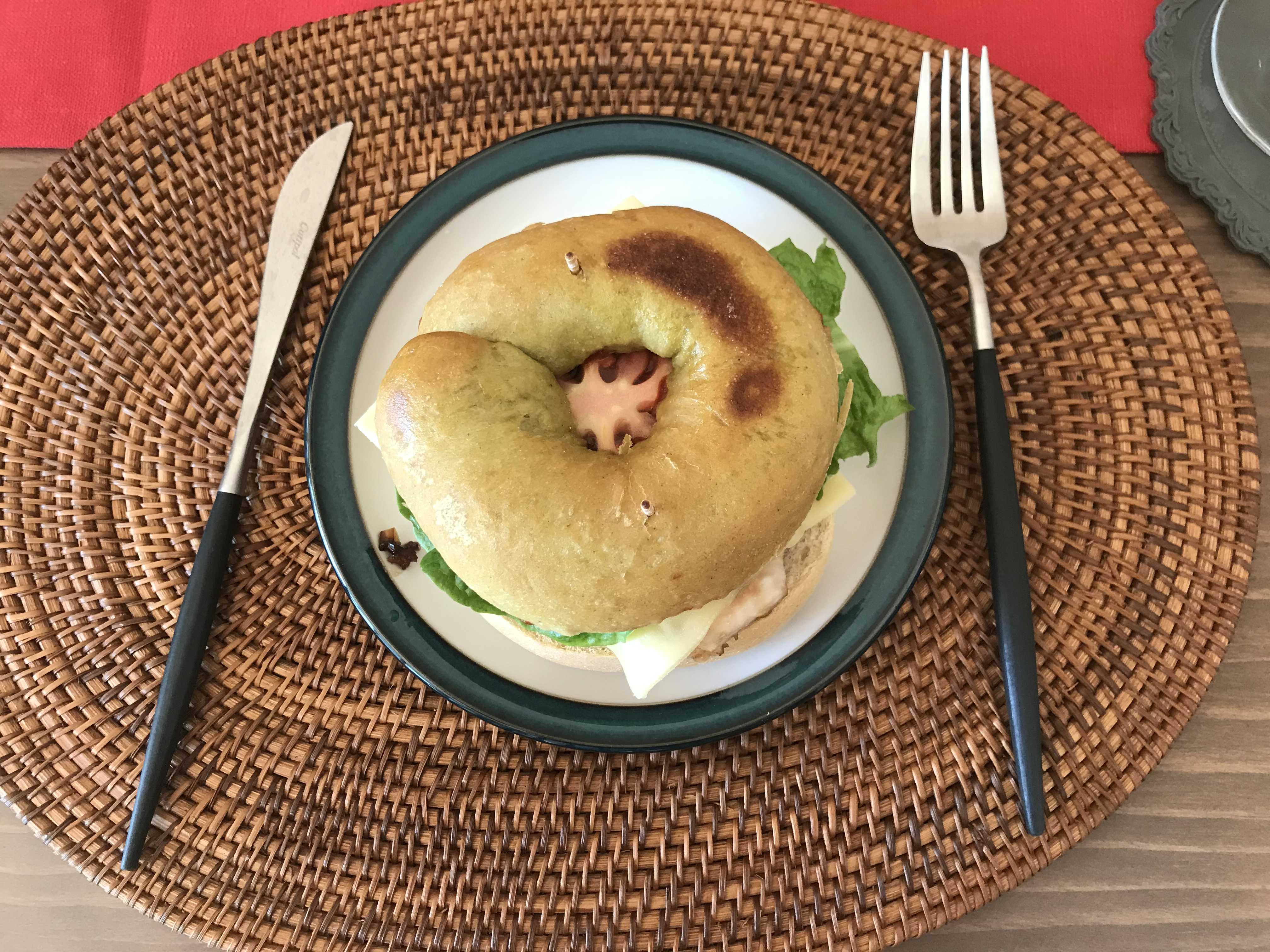 사진속 제품이 꼭 싹이난 감자마냥 초록빛이죠?ㅎ 녹차맛인가 싶겠지만 최근 신상품으로 나온 대파맛 베이글 이랍니다ㅎㅎ 뭔가 샌드위치로 만들면 풍미가 확살고 좋을것만 같아서 요걸보니 샌드위치를 만들어 먹고 싶더라구요~