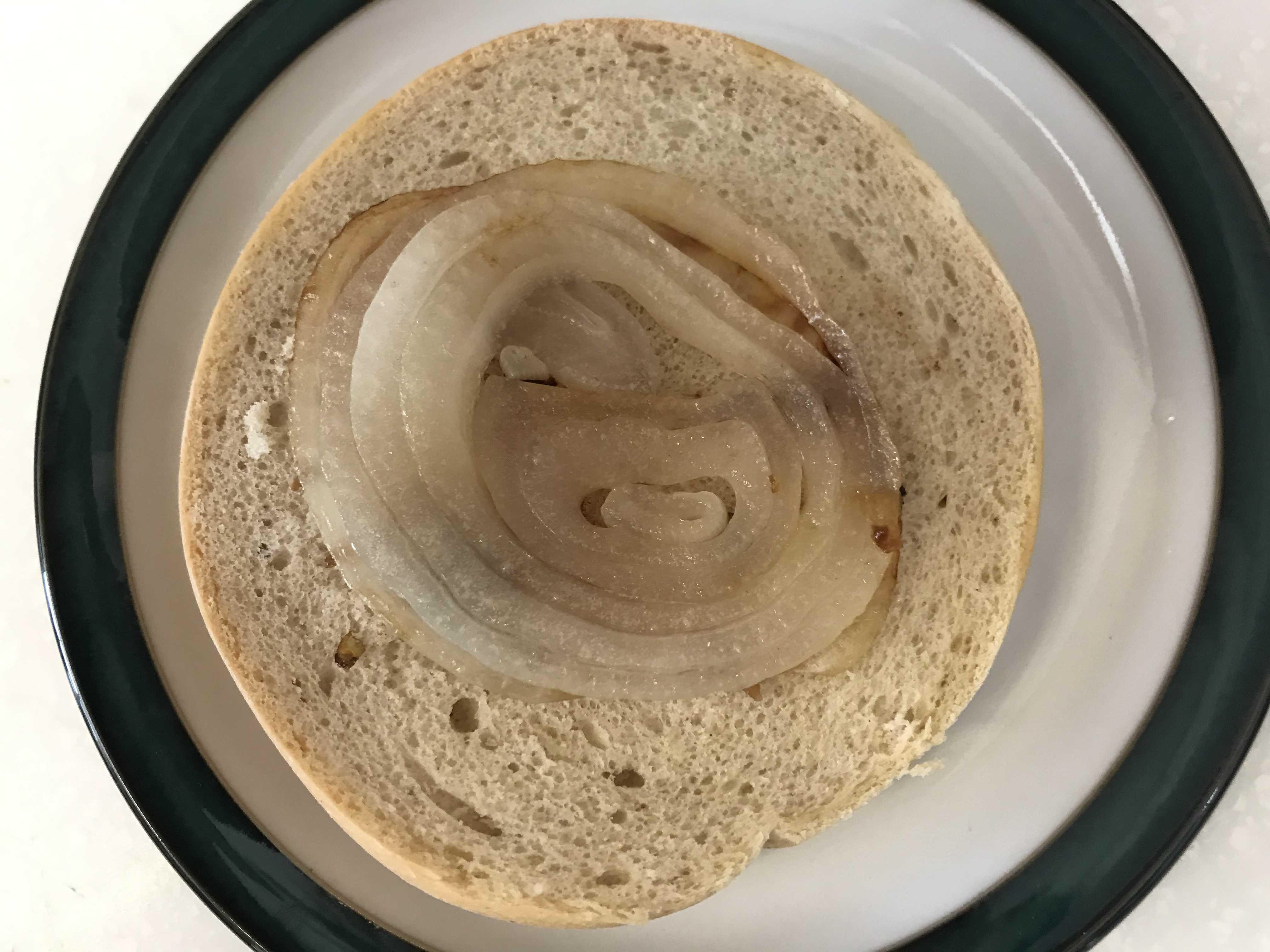 베이글 한쪽면을 펴고 그 위로 잘 구워진 양파를 제일 먼저 올렸어요
