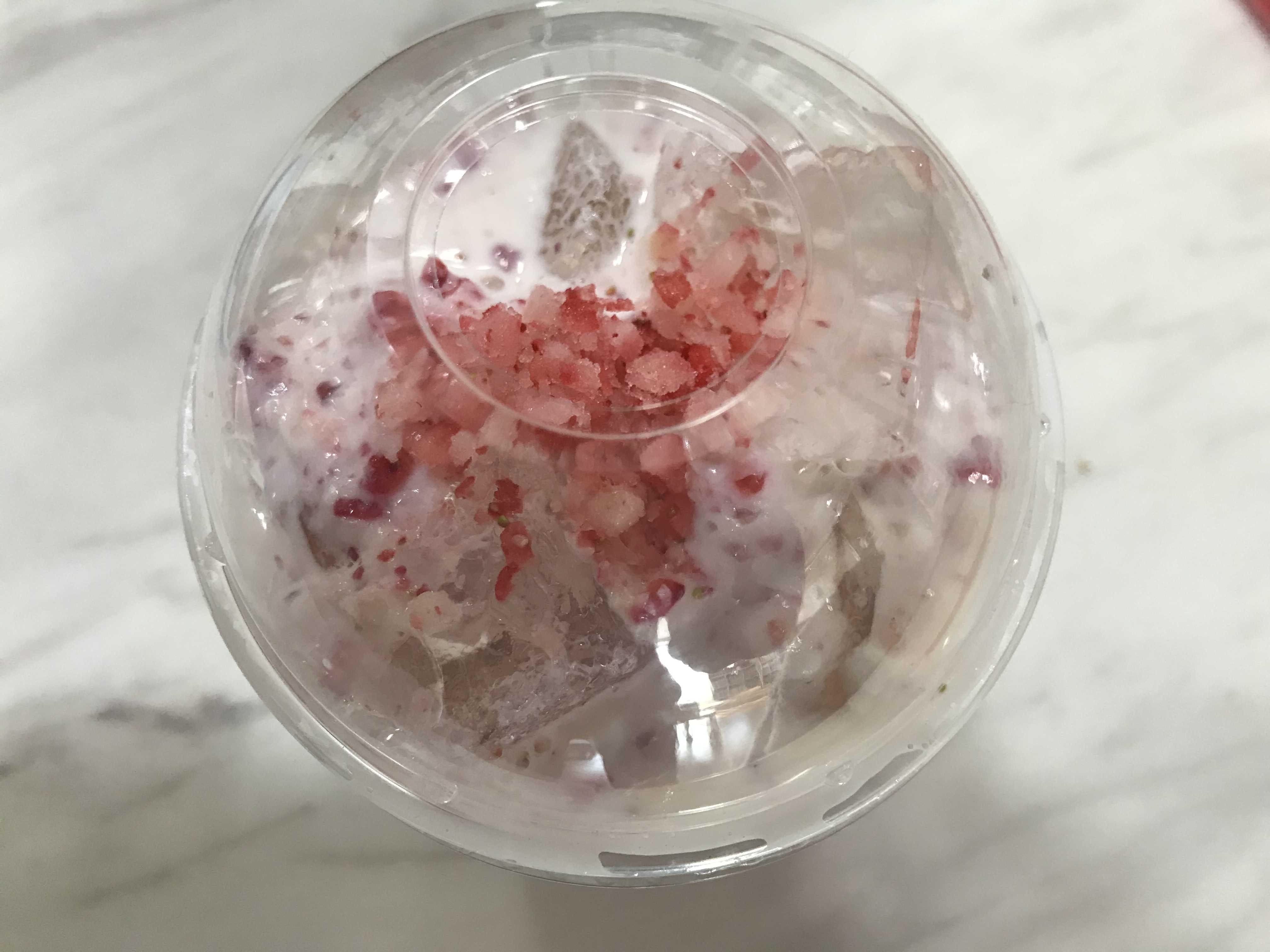냉동딸기를 잘게 다져 고명으로 올라간 모습의 딸기 쥬얼리 쏙쏙 밀크티예요^^