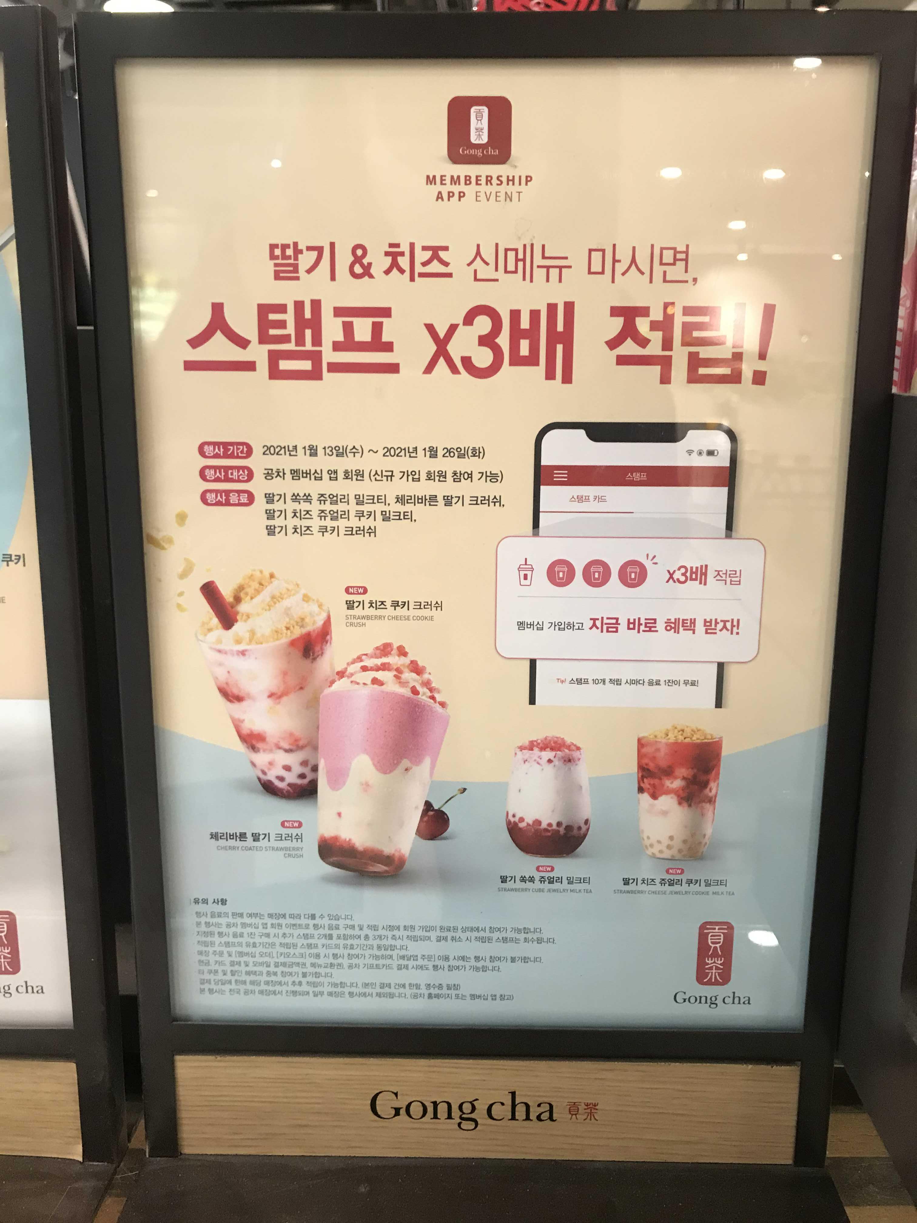 딸기&치즈 신메뉴 출시를 기념한 이벤트로 신메뉴를 주문하면 공차 멤버쉽 스탬프를 3배로 적립해 주고 있어요~ 때문에 저역시 딸기 쏙쏙 쥬얼리 밀크티를 구입하고 공차 적립스탬프 3개를 받았답니다^^