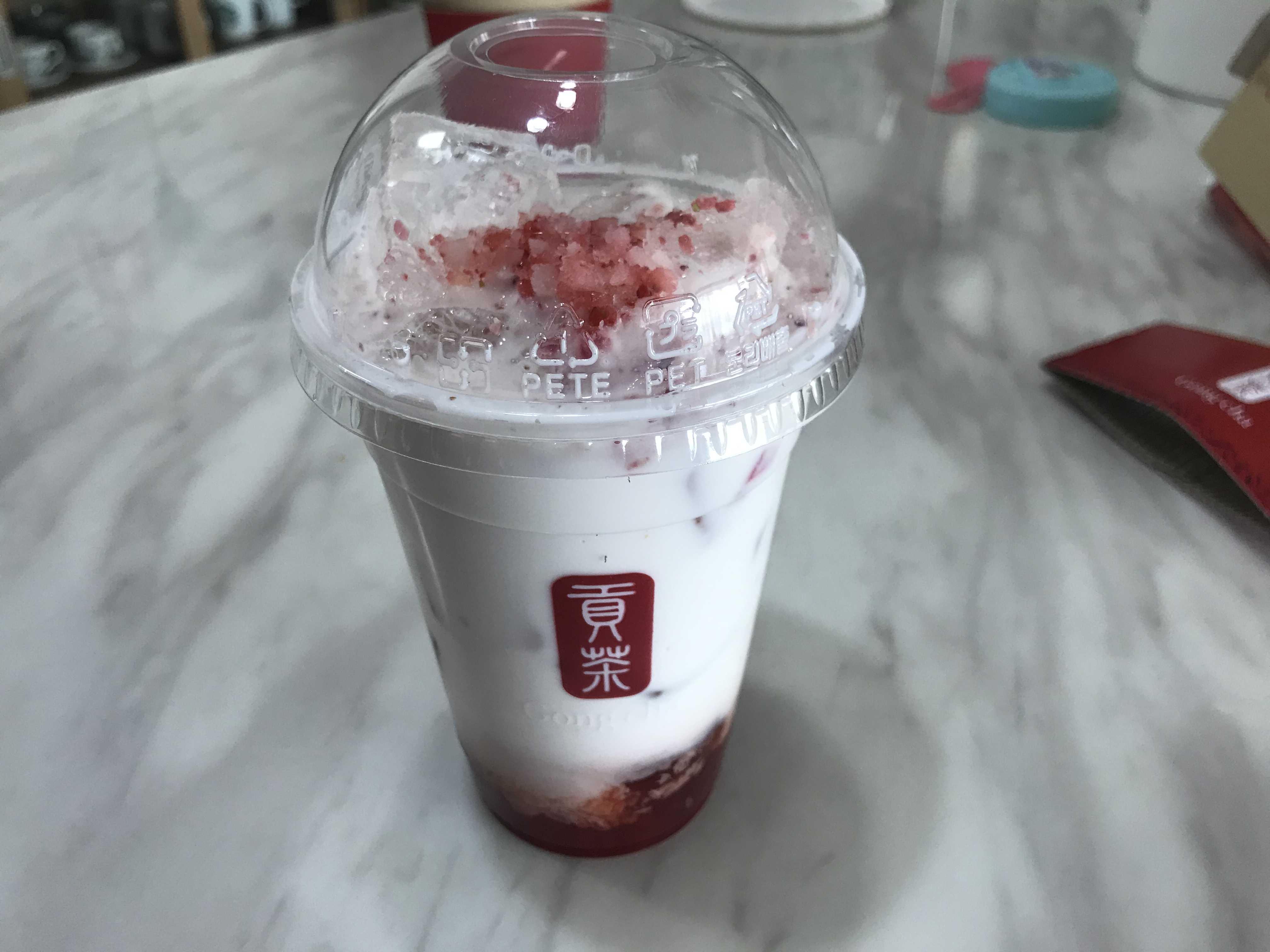 얼핏 보면 비슷해 보이긴 하지만 공차만의 시그니처인 펄이 들어 있어 말랑 말랑 씹는 맛과 더불어 우유속에 담긴 얼음 위로 곱게 갈린 딸기 다이스가 올라간 점은 폴바셋의 딸기 라떼보다 좀더 풍성한 비주얼이랍니다