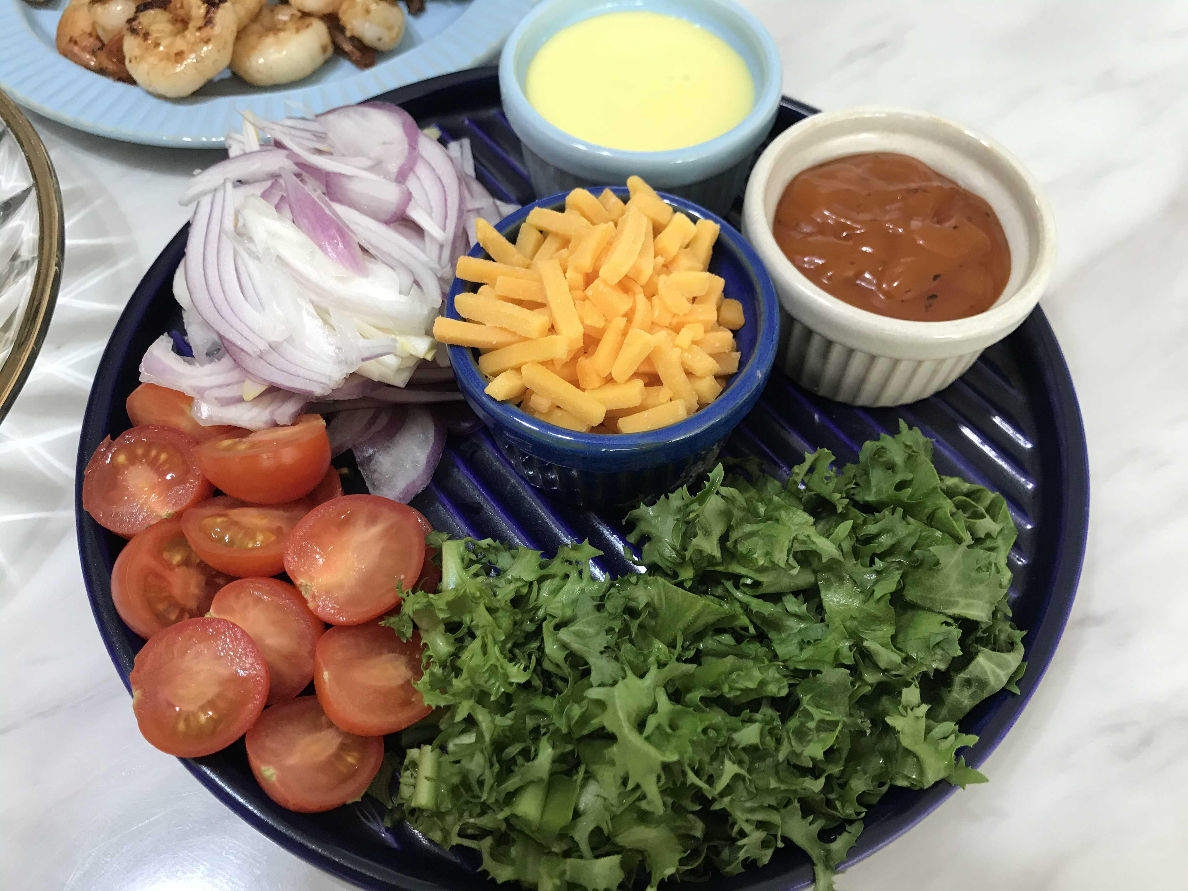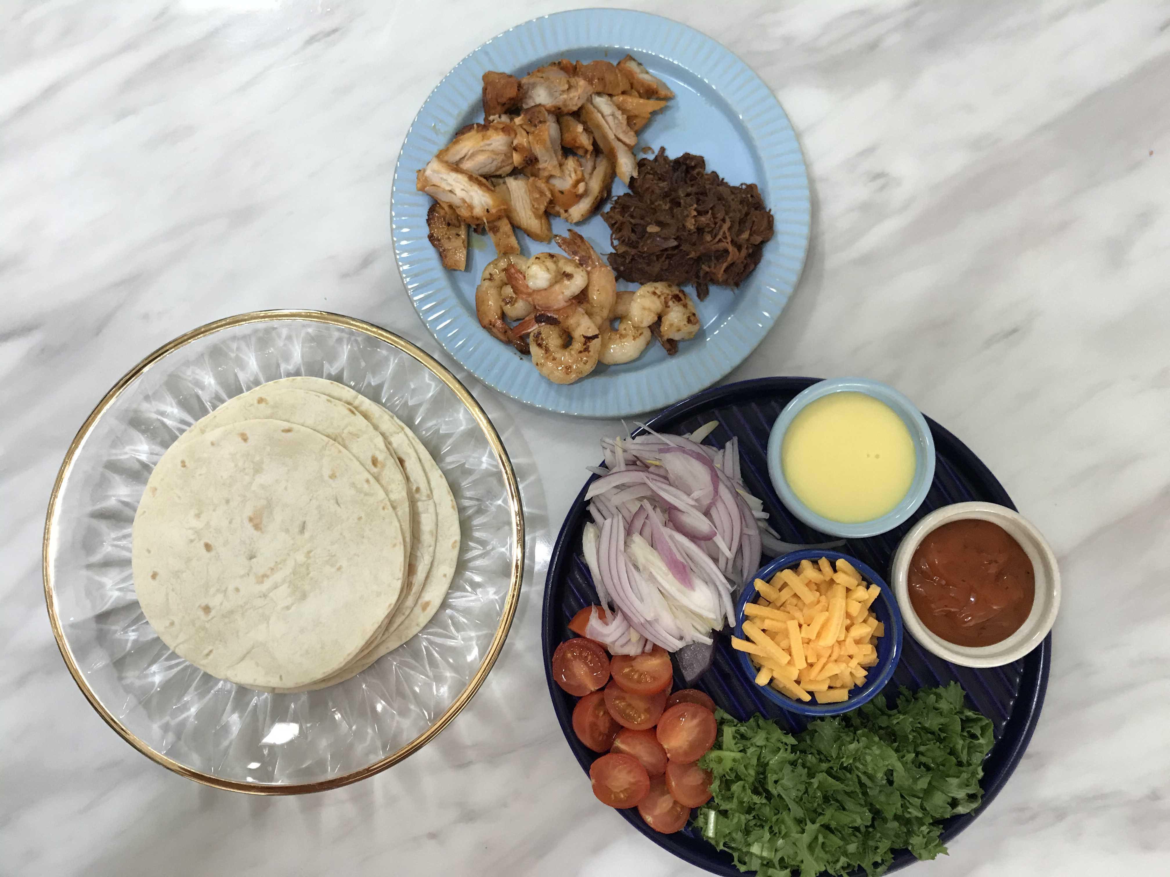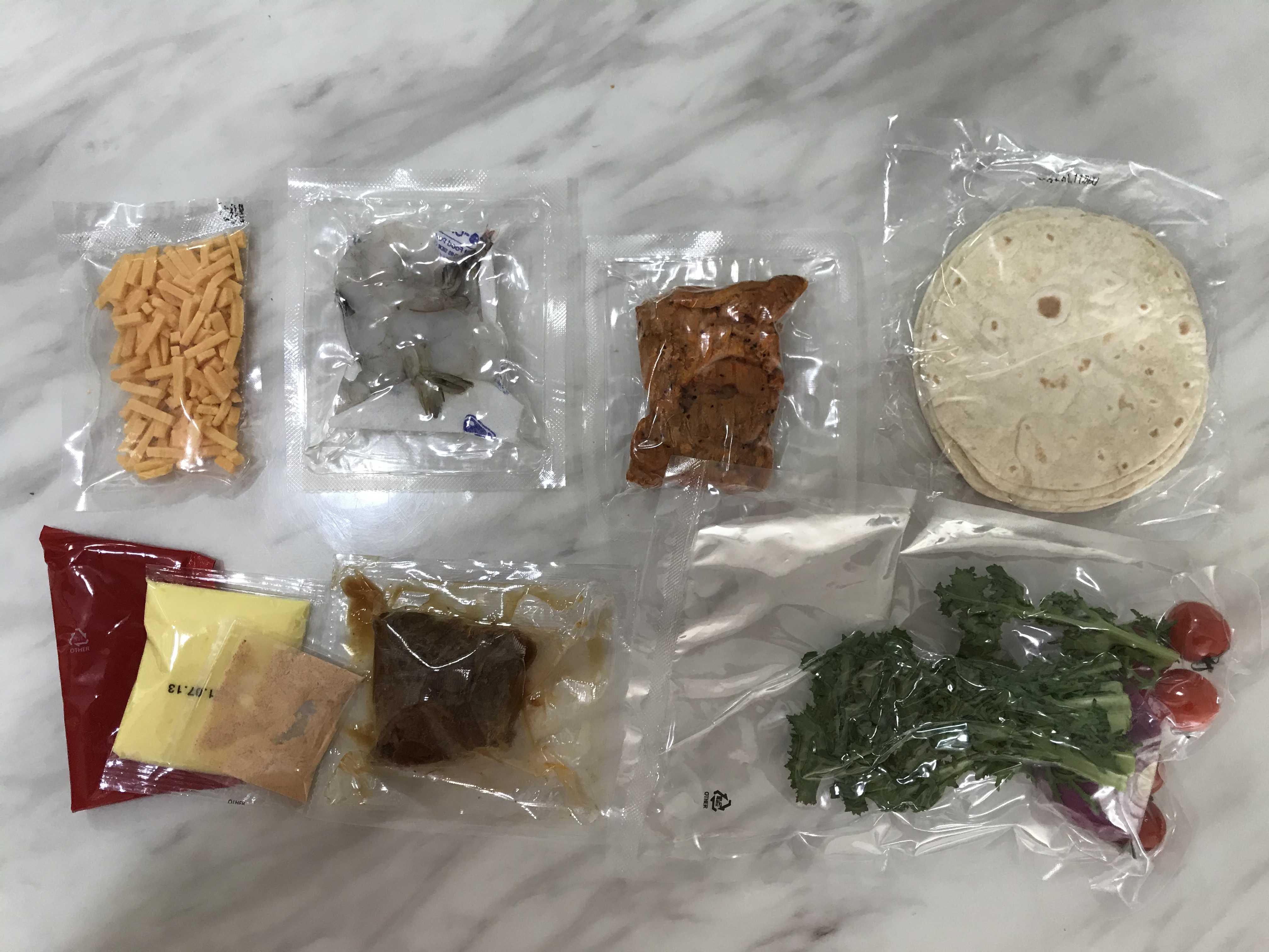 시즈닝과 소스류 그리고 고기 두종류(닭고기&소고기)와 생새우, 야채류와 또띠아가 있어요