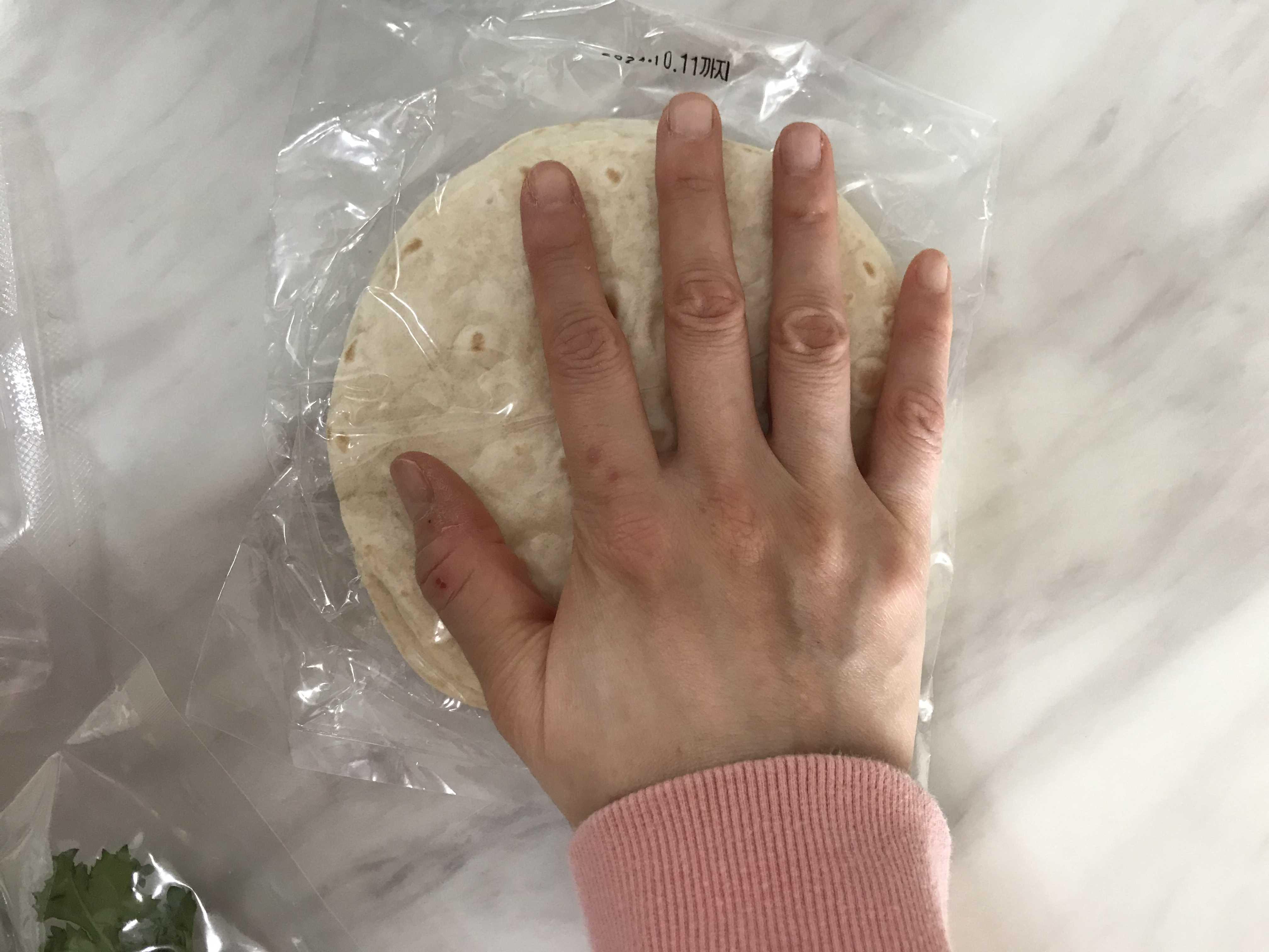 또띠아의 크기는 제 손바닦보다 조금 작은 사이즈로