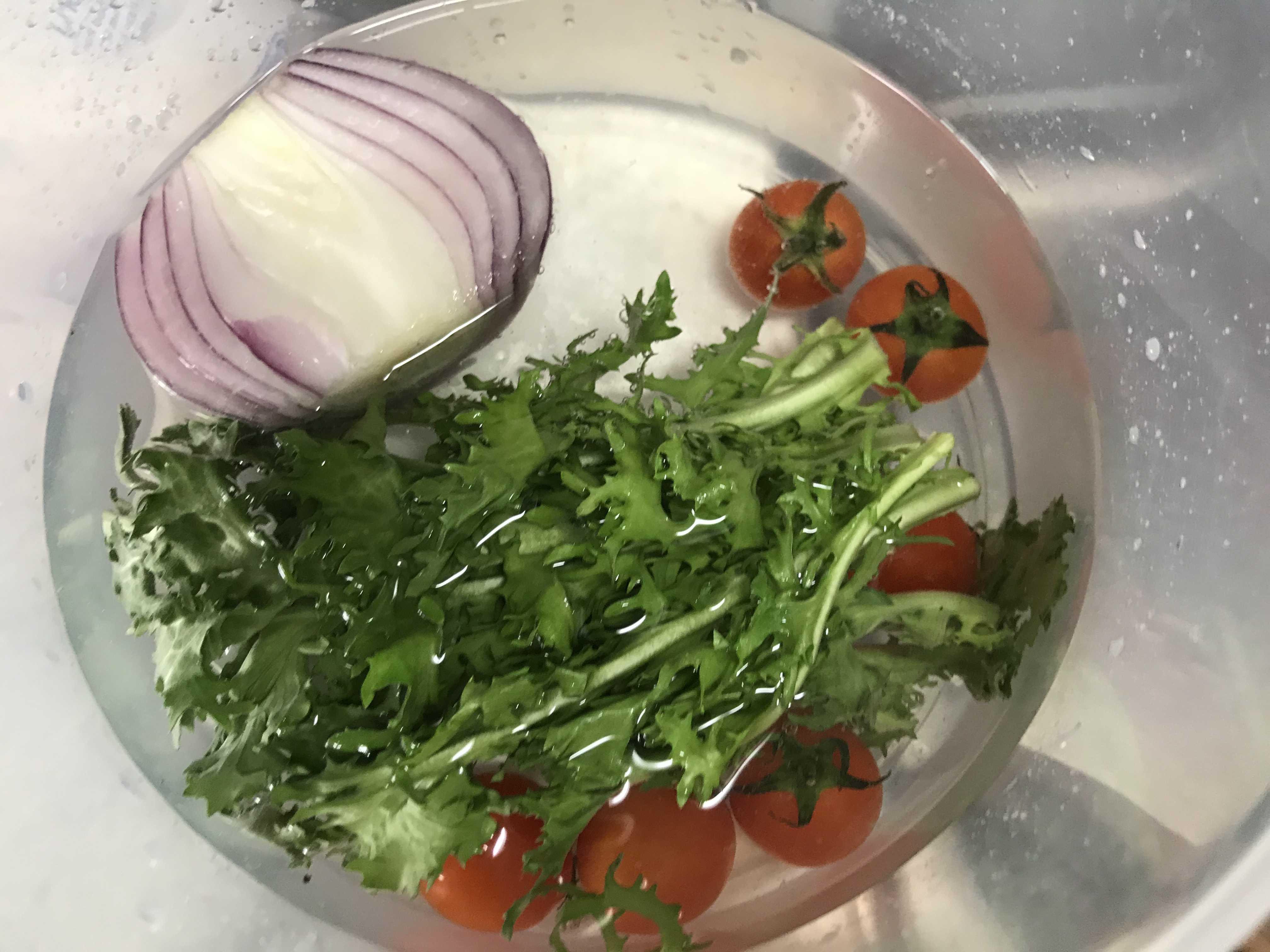 물에 담궈둔 야채는 흐르는 물에 다시 깨끗히 씻어낸뒤 적양파는 슬라이스로 썰어 준비하고 치커리는 쫑쫑 한입크기로 썰고 방울 토마토는 반으로 잘라서 접시에 잘 담아주었어요~
