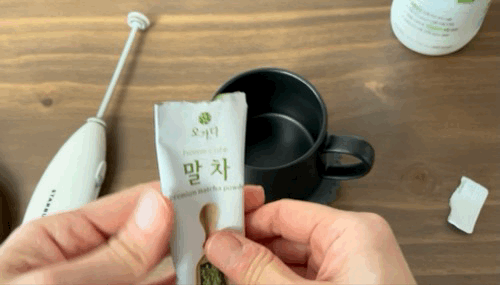 먼저 오가다 말차 스틱 한포를 뜯어서 컵에 넣은뒤