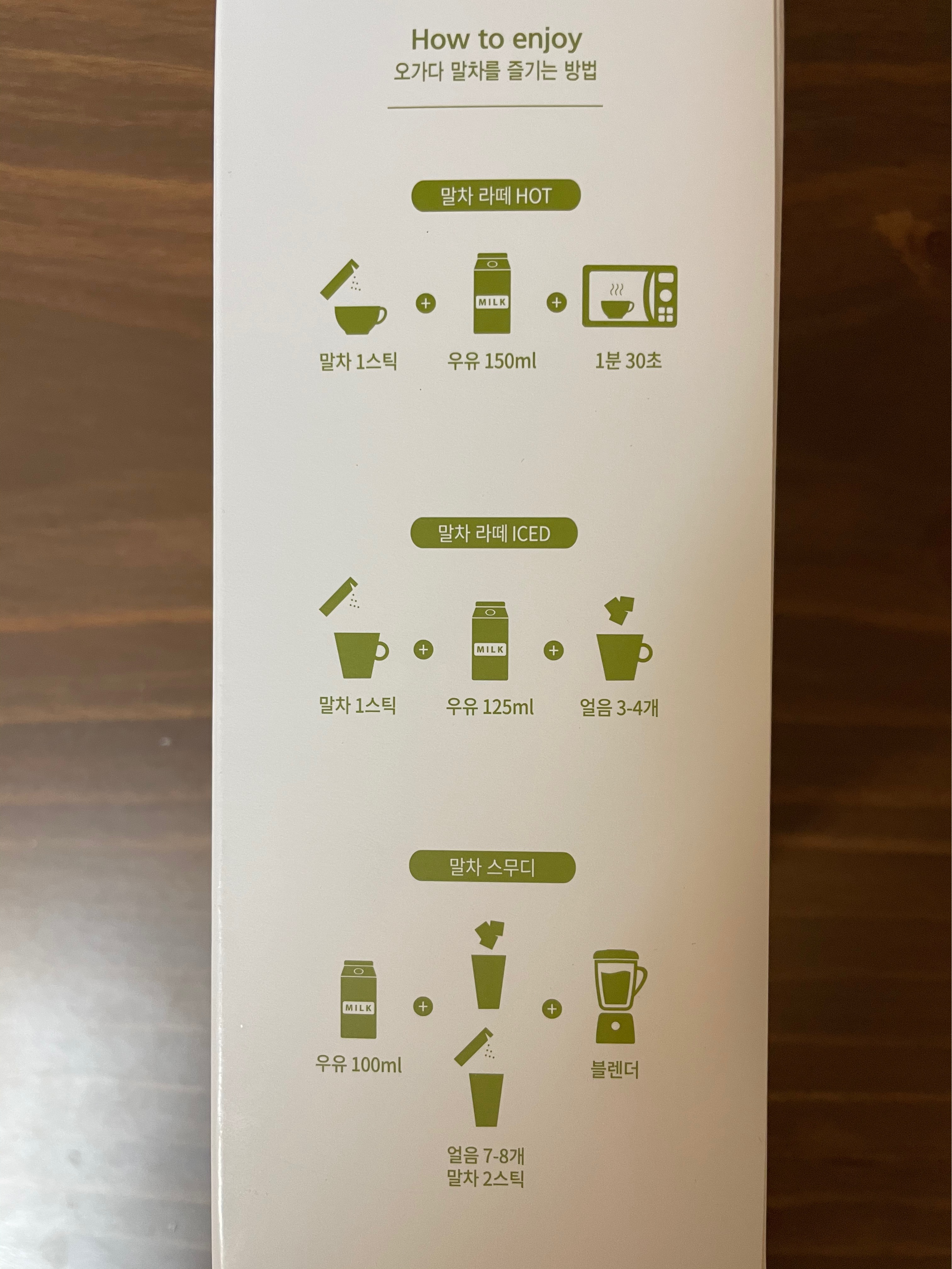 상자 옆면에는 오가다 말차를 즐기는 다양한 방법이 제시되어 있는데요~ 따뜻한 말차라떼와 아이스 말차라떼 그리고 얼음을 함께 갈아 만들어 시원하고 맛있는 말차 스무디까지 서로 다른 세가지 레시피를 각각 만들어 맛이 어떻게 다른지 비교해 보기로 합니다ㅎ