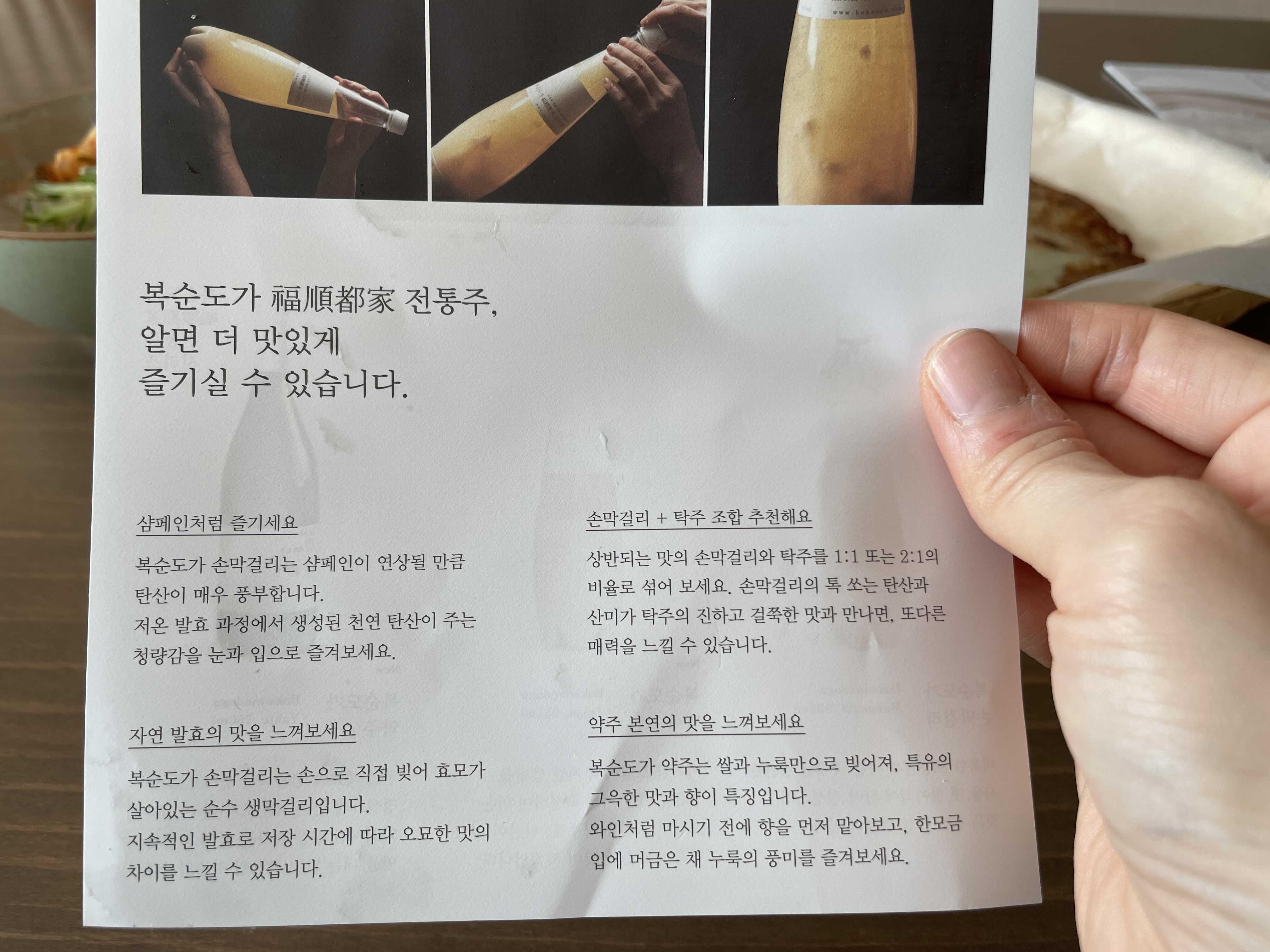 막걸리를 먹으면 가장 힘든 부분이 먹고나서 다음날 일어났을때의 숙취가 아닐까 싶은데요~ 복순도가 손막걸리의 경우 다음날 먹고 일어났을때도 숙취때문에 괴로울일도 없더라구요~ 먹고도 머리 아프지 않은 막걸리는 처음이라 신기하더라구요ㅎㅎ