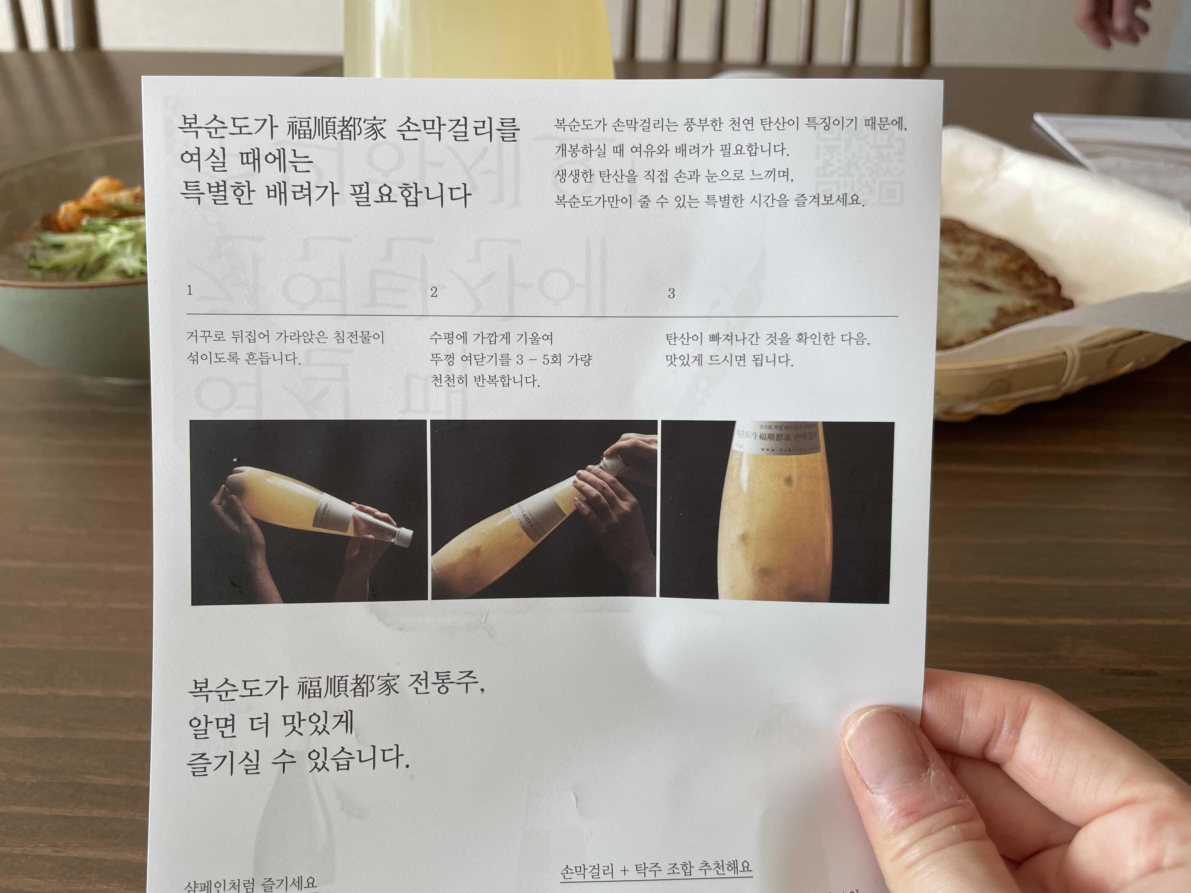 처음먹어보는 복순도가 생막걸리를 마시기전 어떻게 마셔야 하는지 막걸리와 함께 동봉된 설명서에 나와있는 내용들도 스르륵 한번 훑어 봤어요~ 전통 누룩이 발효되는 과정에서 자연 생성된 복순도가 손막걸리의 특징인 천연 탄산이 아주 강하기 때문에 그냥 드시면 안되구요~ 설명서에 나와있는 방법대로 잘 섞어준뒤 탄산을 다 빼준뒤에 먹어 보기로 했어요~