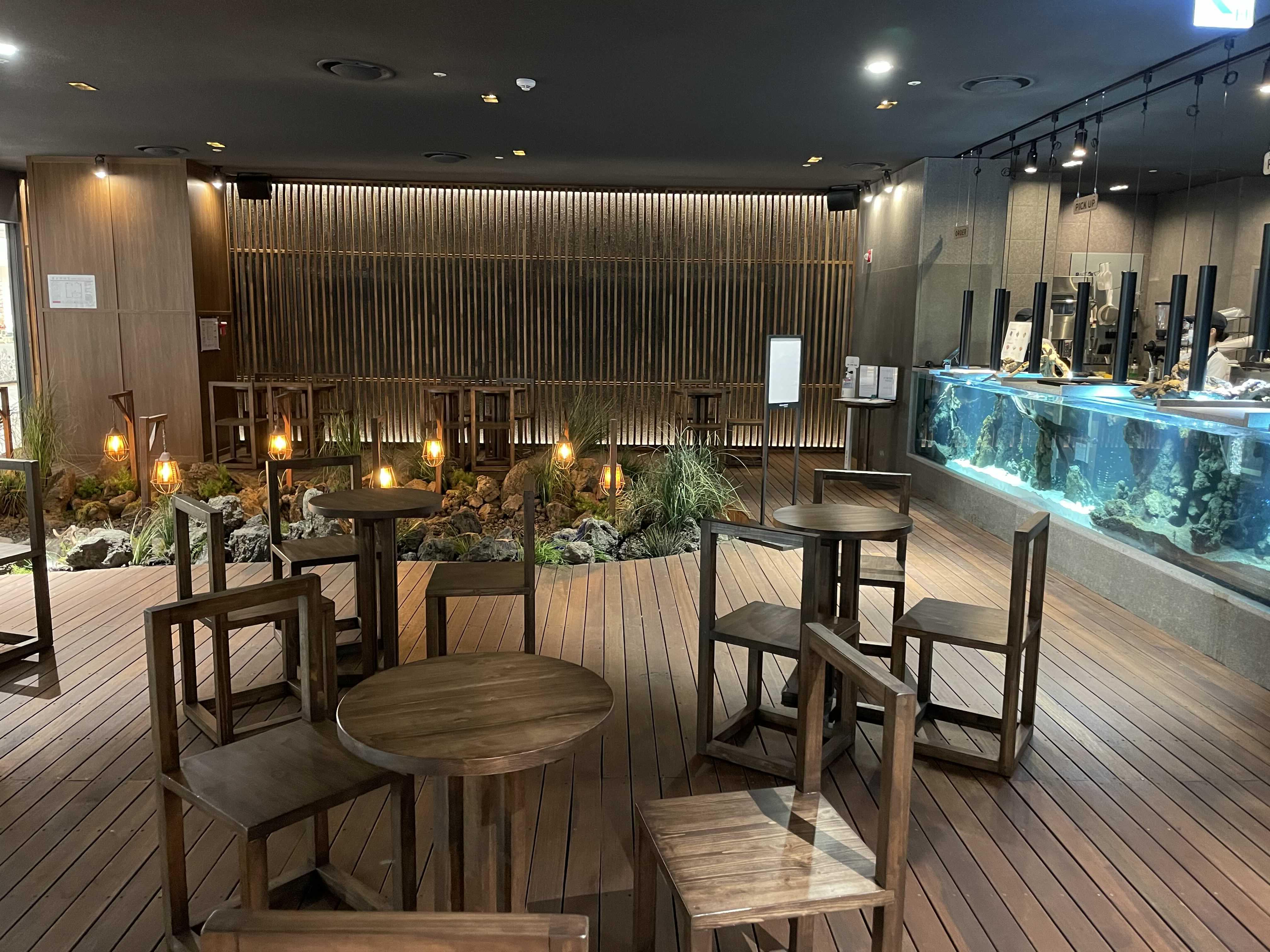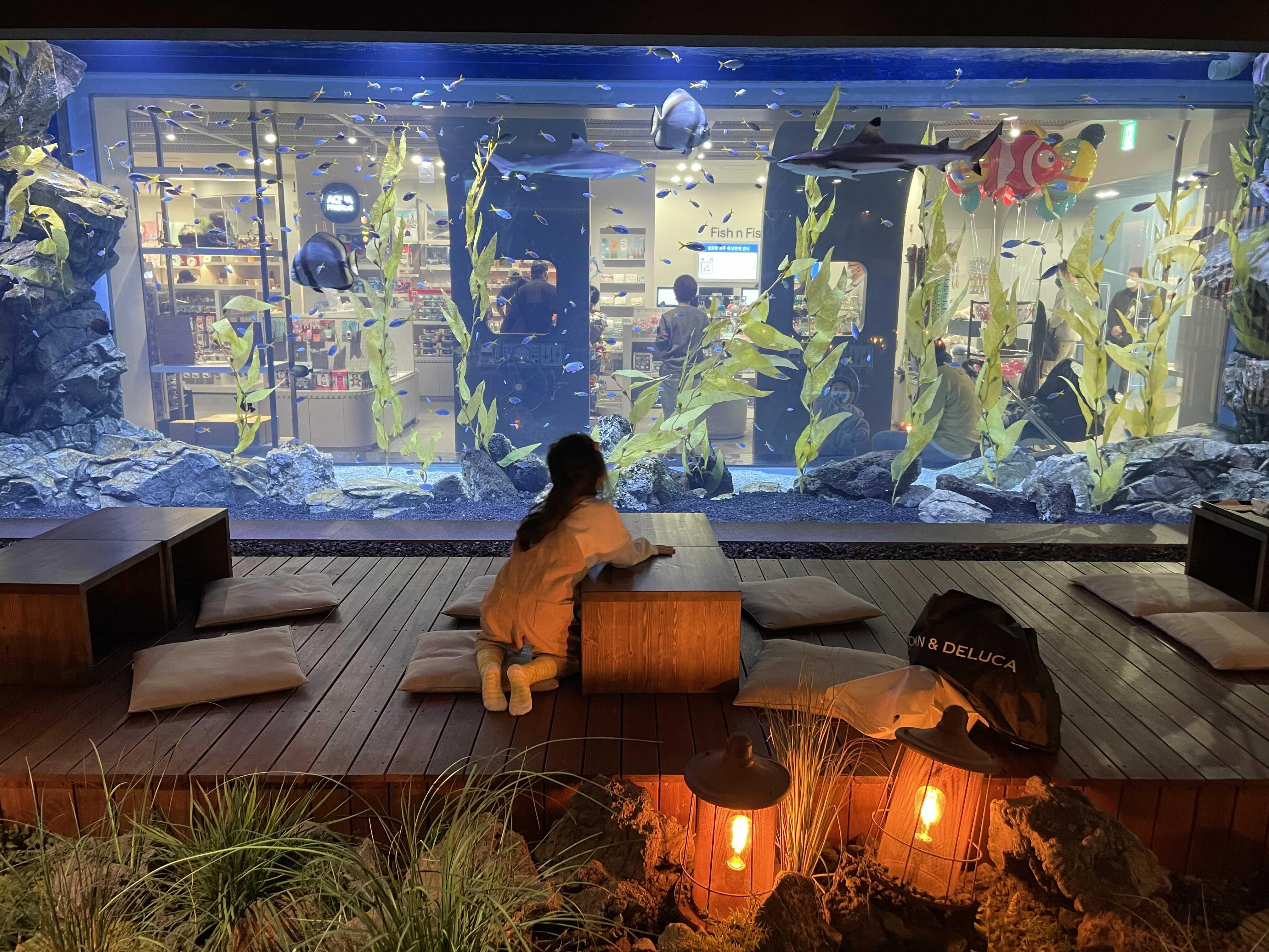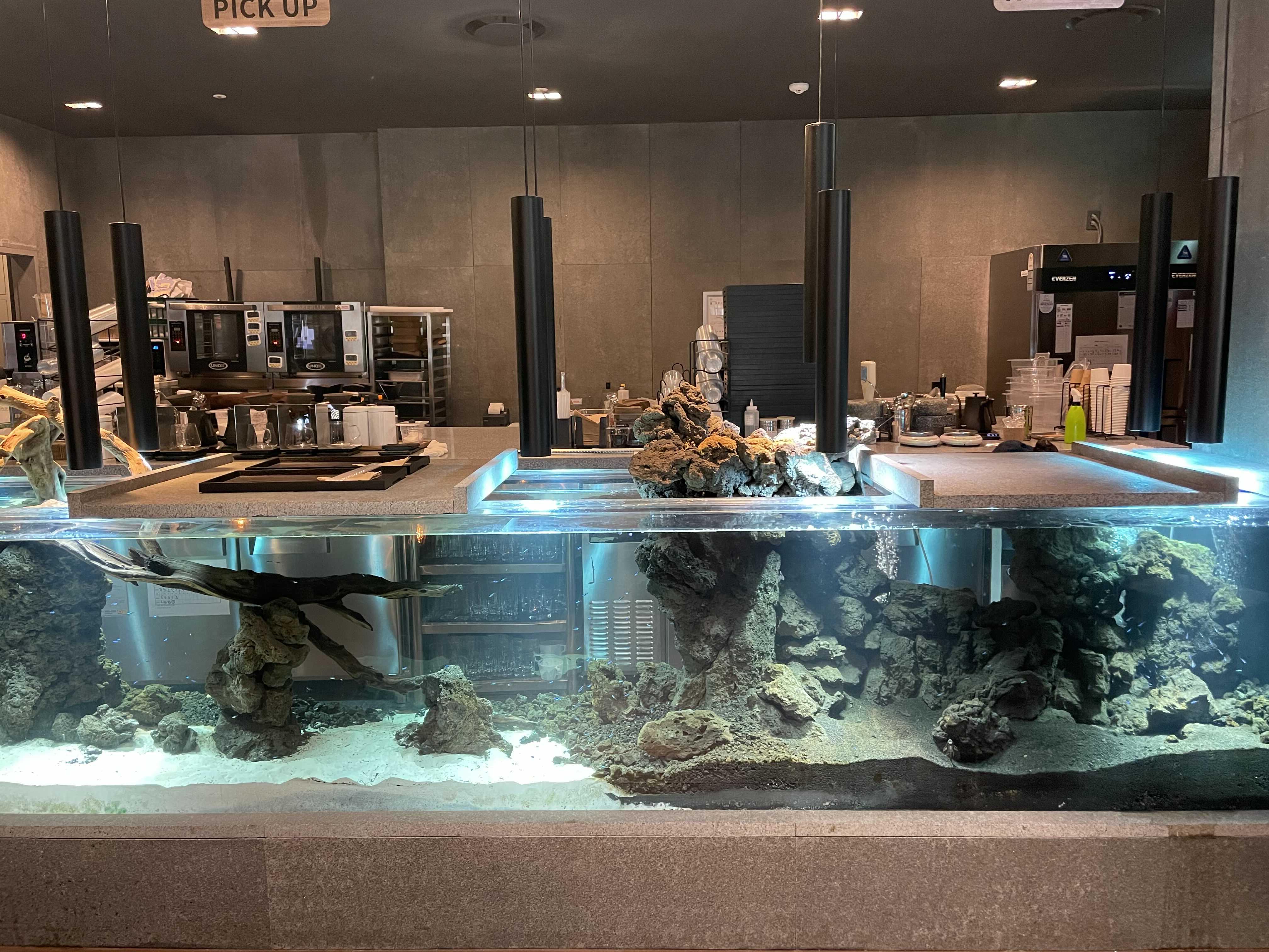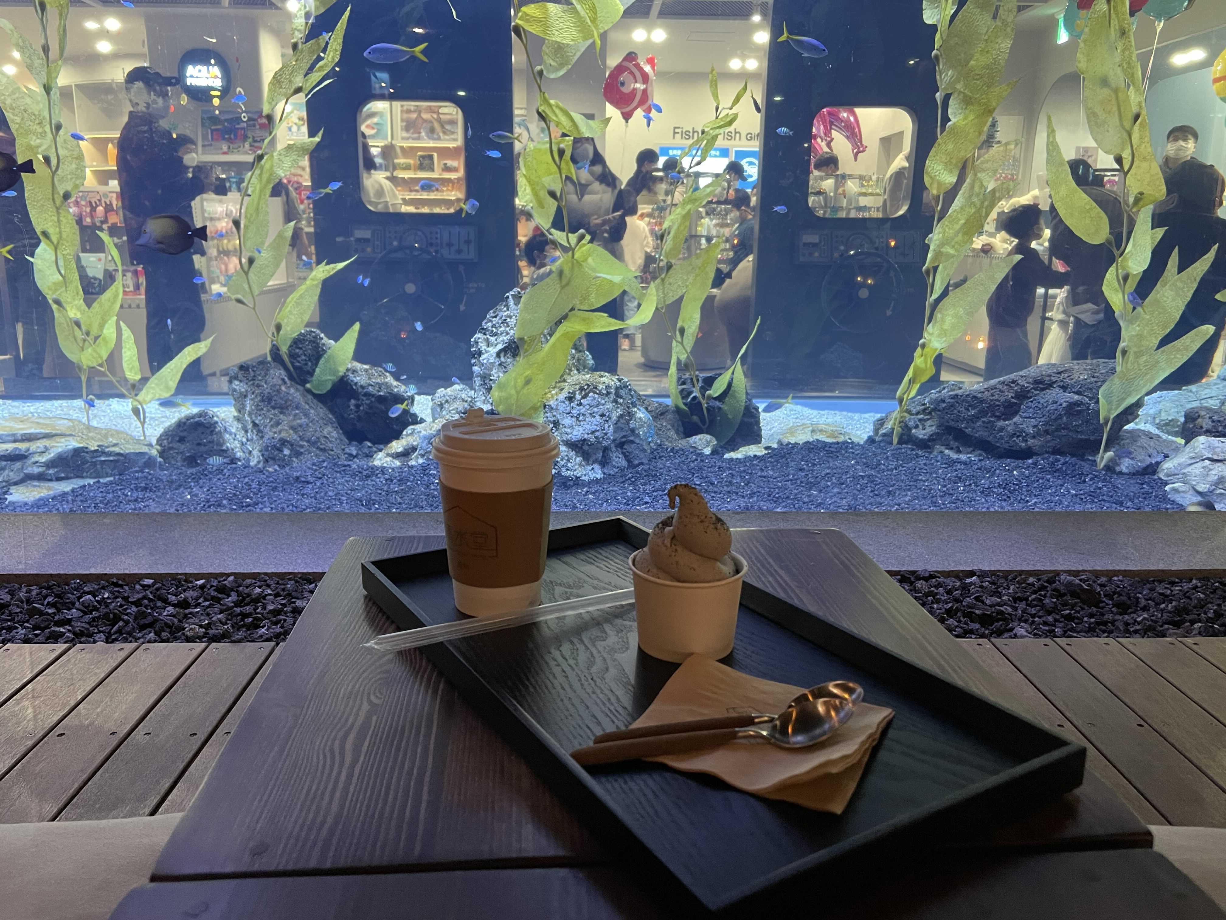 카페 우측에는 한화 아쿠아플라넷 광교점이 바로 옆에 위치해 있어 통유리로 된 대형 수족관이 보이는 구조로 넓은 규모의 카페는 아니지만 개방감이 느껴져 답답하지는 않더라구요~