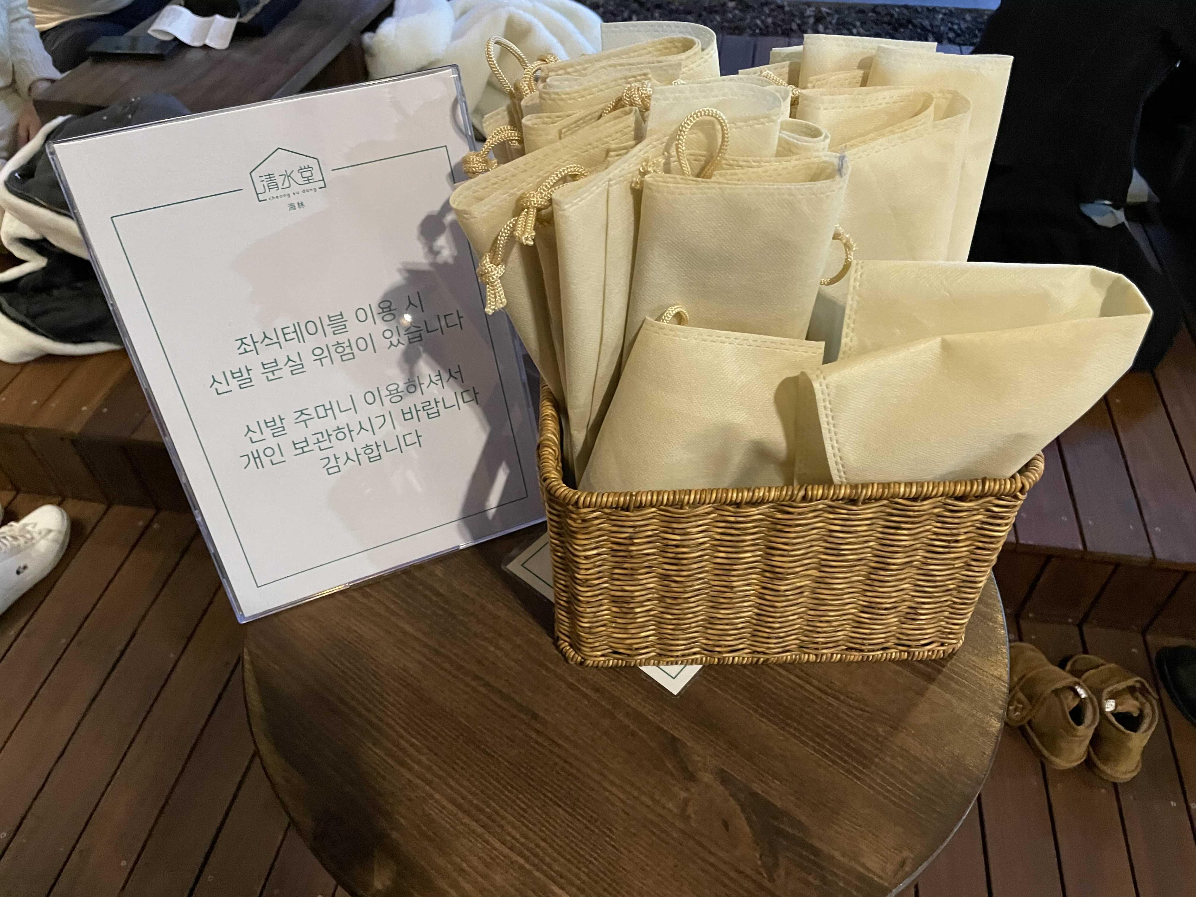 청수당에는 테이블 좌석들과 함께 신발을 벗고 이용하는 좌식테이블이 있는데요~ 기다란 마루 형태인 좌식테이블의 경우 신발 분실 위험을 방지하고자 신발 주머니를 이용해 신발을 보관 할 수 있도록 되어 있더라구요~