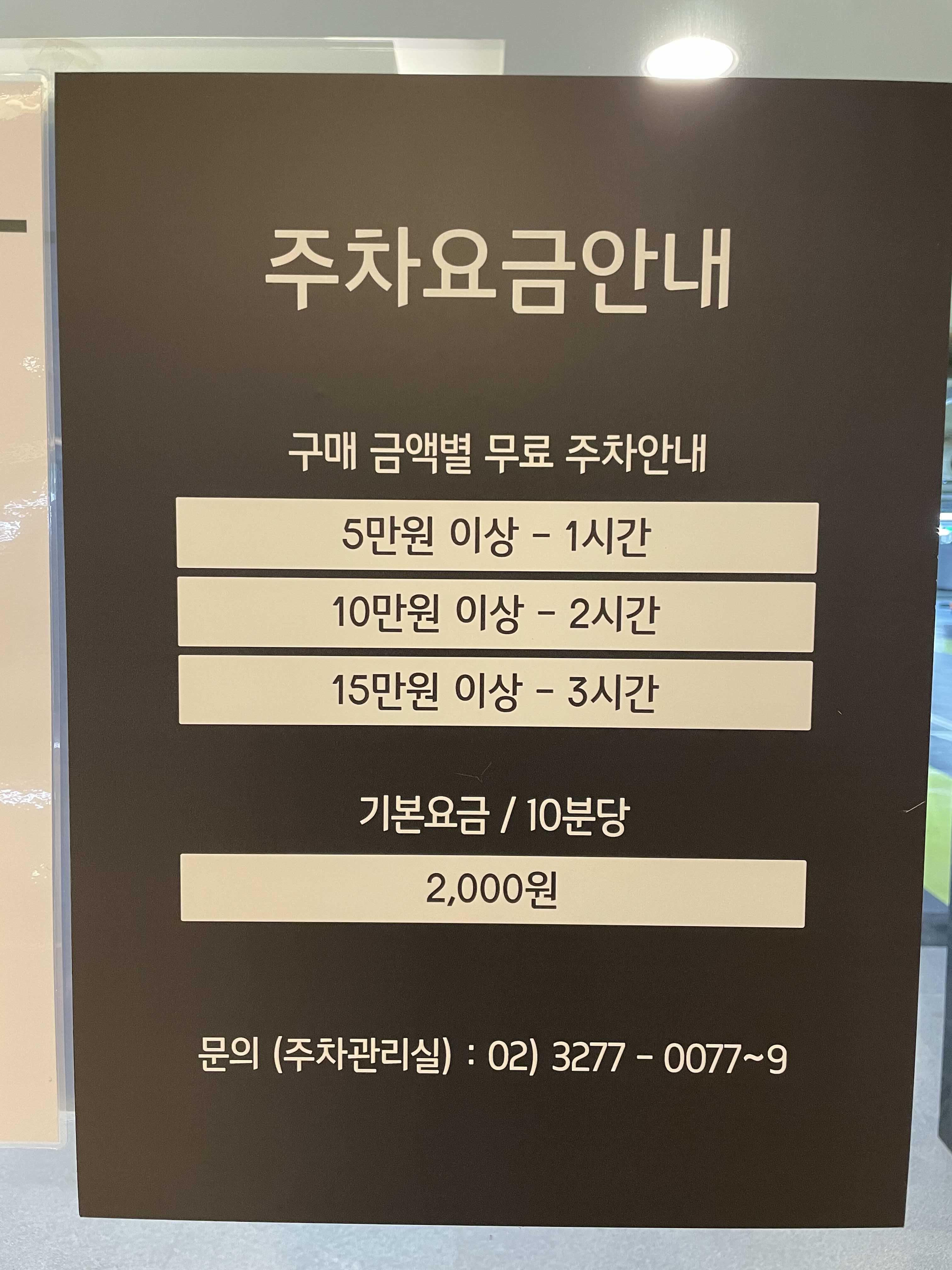 처음 30분은 무료지만 이후로는 기본요금이 10분당 2천원으로 한시간에 무려 12,000원의 주차요금이 발생하는데요~ 쇼핑시 주어지는 무료주차혜택도 오만원 이상 구매시 한시간 무료라서 무료주차 혜택을 받으시려면 상당히 많은 비용이 들어감을 알 수 있어요