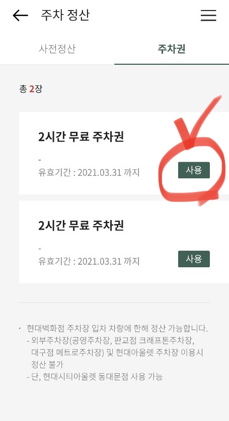 다행이도 현대백화점 앱을 설치하셔서 회원가입을 하시면 ID당 월별 2시간 무료주차 쿠폰 2장을 발급받으실 수 있어요^^