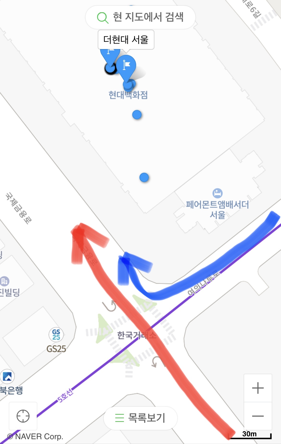 편의상 제가 지도에 빨간색 과 파란색 화살표로 표시를 해 두었는데요~ 보통 네비에서 안내해주는 방향대로 더현대서울을 방문하실경우 빨간색 화살표 방향으로 안내를 해주는데요~ 이길따라 가시면 백화점을 목전에 두시고 30분 넘게 길바닥에 발이 묶이는 지옥을 경험하시게 될거예요🔥🔥 한국거래소 사거리 직진 신호가 무척 짧은데다가 2차선이 좌회전 전용 차선임에도 직진해서 도중에 끼어드는 차량들도 많았고 반대편의 유턴하는 차량들까지 합세해서 그야말로 헬입니다