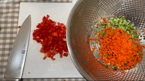 오이, 당근, 파프리카는 잘게 잘게 썰어서 준비해 주세요