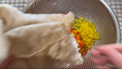 이렇게 면보에 담아 꾸욱 눌러서 짜주면 두부 물기제거가 좀더 쉬워요
