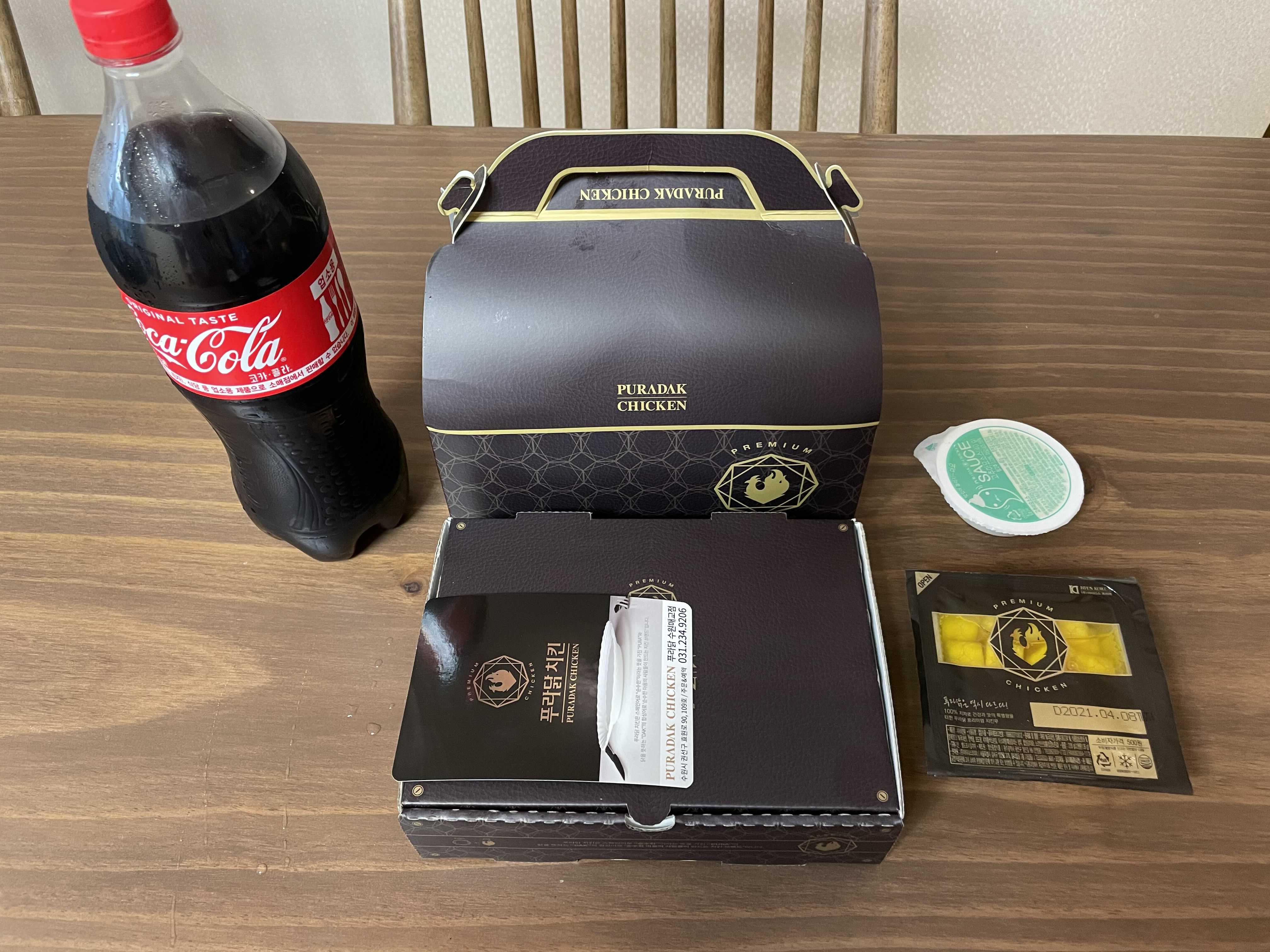 오늘은 푸라닭에서 새로나온 메뉴중 하나인 제너럴 핫 치킨 한마리와 추가로 파불로 치킨 반마리를 주문해 먹어보기로 했어요~ 자주 시켜서 그런건지 한마리 반을 시켜서 그런건지 서비스로 콜라를 큰걸 주셨네요~