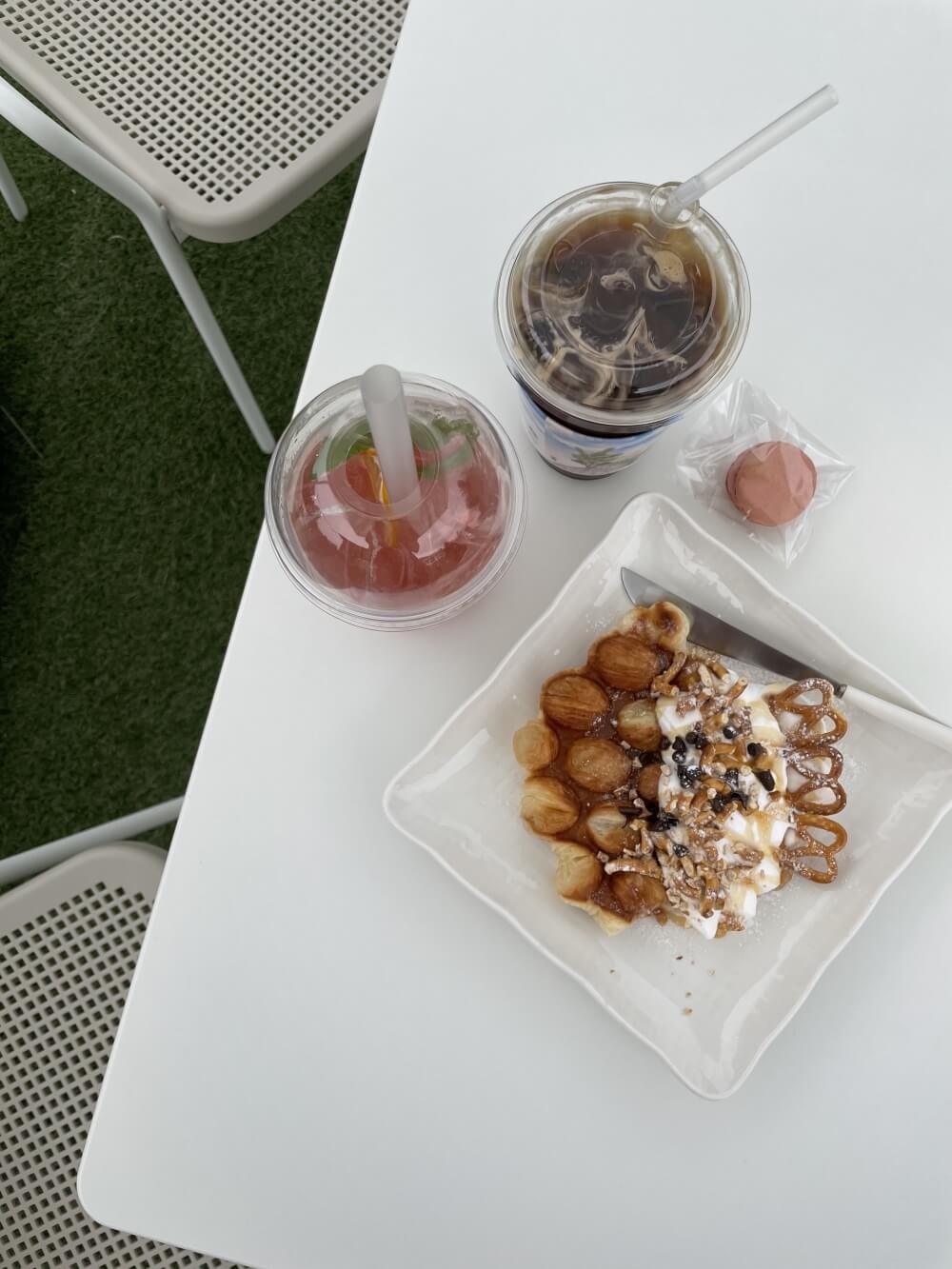 저는 이날 기본인 아이스 아메리카노한잔과 딸기에이드 한잔 그리고 디저트 메뉴로는 마카롱과 생크림 크로플을 주문해 보았는데요~ 디저트 메뉴들의 가격은 그럭저럭 나쁘지 않았지만 음료 가격대가 꽤 높게 책정되어진듯 했어요~