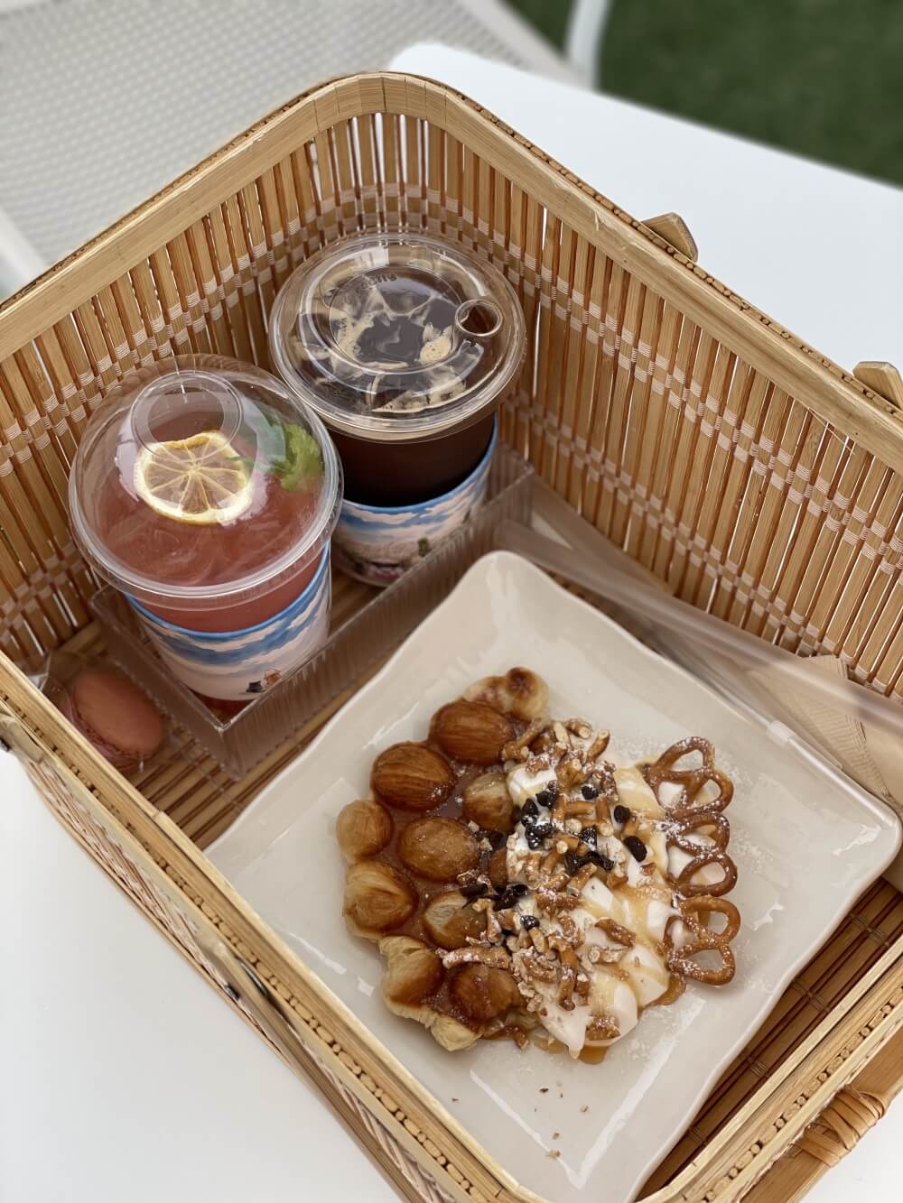 주문한 메뉴들이 이렇게 피크닉 바구니안에 안쓰러지게 잘 담겨져 있었어요~ 야외 테이블에 자리를 잡고 앉아 조심스레 꺼내어 맛을 보기로 했어요☺️