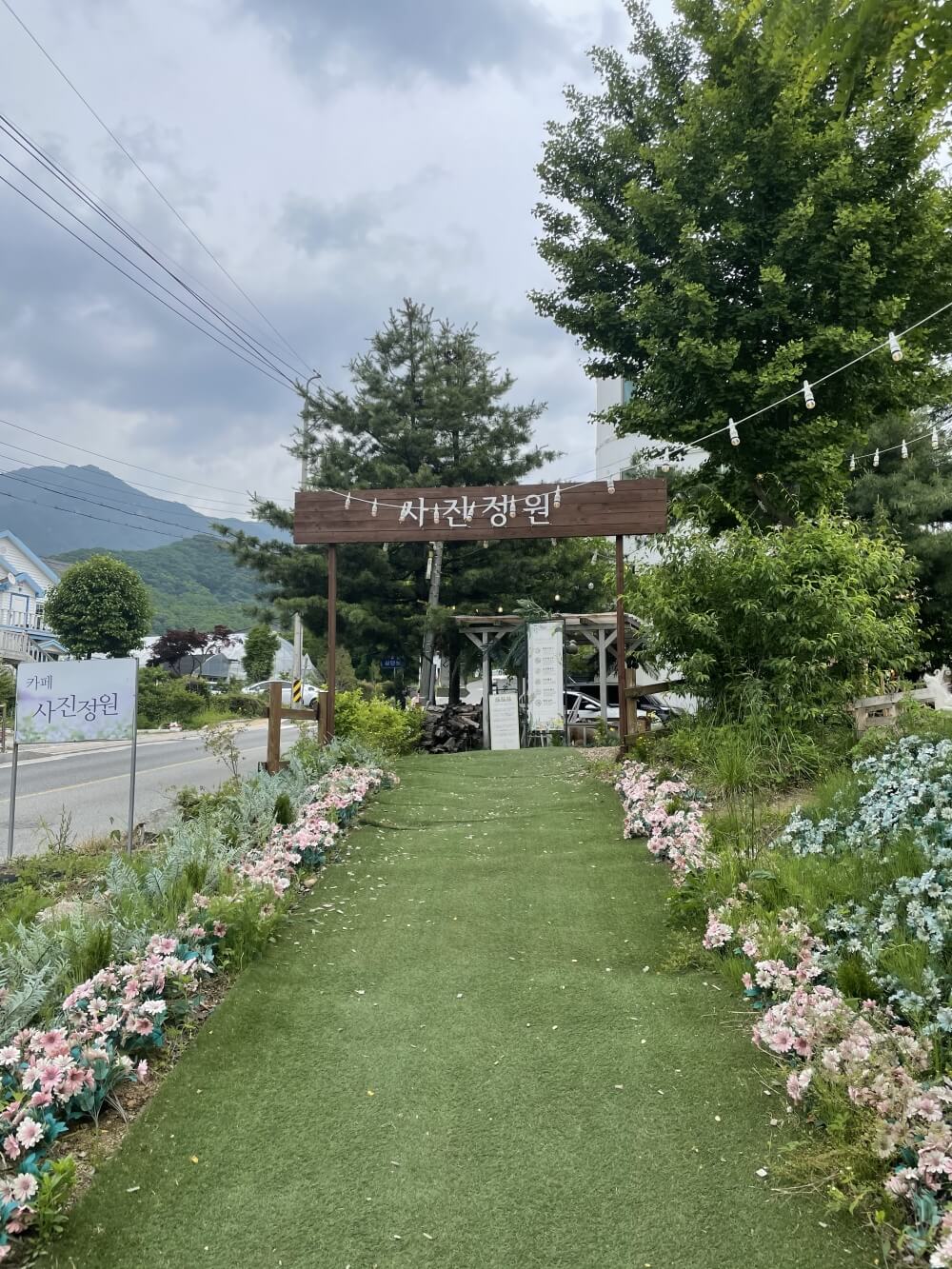 분명 출발할때는 맑고 화창한 날씨였는데 말이죠🥲 카페에 도착해서보니 어느새 날씨가 흐리고 비가 오려고 하더라구요😭 기왕에 달려왔으니 즐겁게 놀다 가기로 하고 주차를 한뒤 주차장 뒷쪽으로 난 잔디길을 따라 카페 입구로 향했어요~