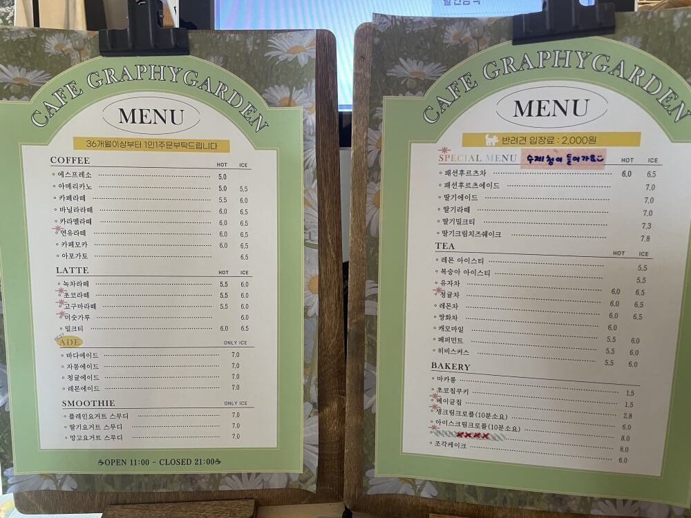 입장하기전 메뉴를 주문해 보기로 했어요~ 커피메뉴를 비롯해 차나 에이드 등의 음료들을 판매하고 있는 카페정원에는 종류가 많지는 않았지만 약간의 디저트 메뉴들도 판매중이였어요~