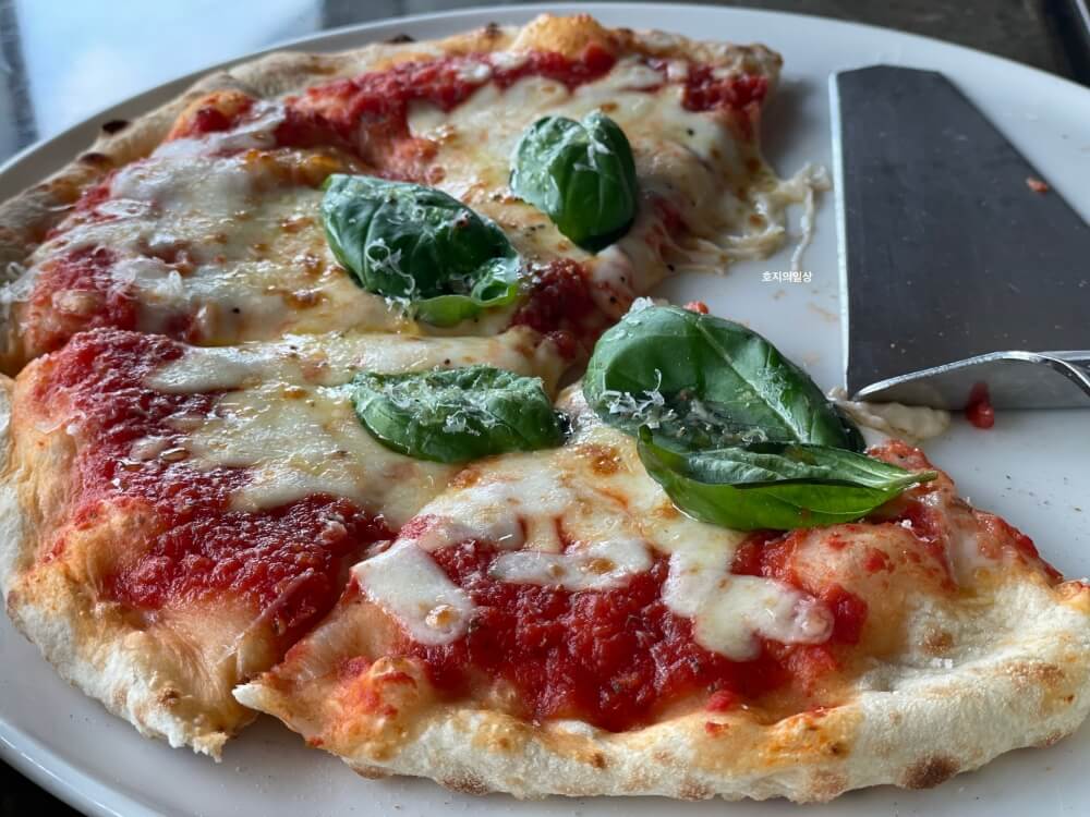 피자를 좋아하는 숭이를 위해 주문한 피자는 가장 베이직한 마르게리타 피자로 주문을 해봤는데요~ 도우가 마르게리따 치고는 살짝 도톰한 것을 제외하면 피자맛은 아주 무난했어요~ 특별히 맛있지도 맛없지도 않은 쏘쏘한 맛으로 지극히 평범했어요~