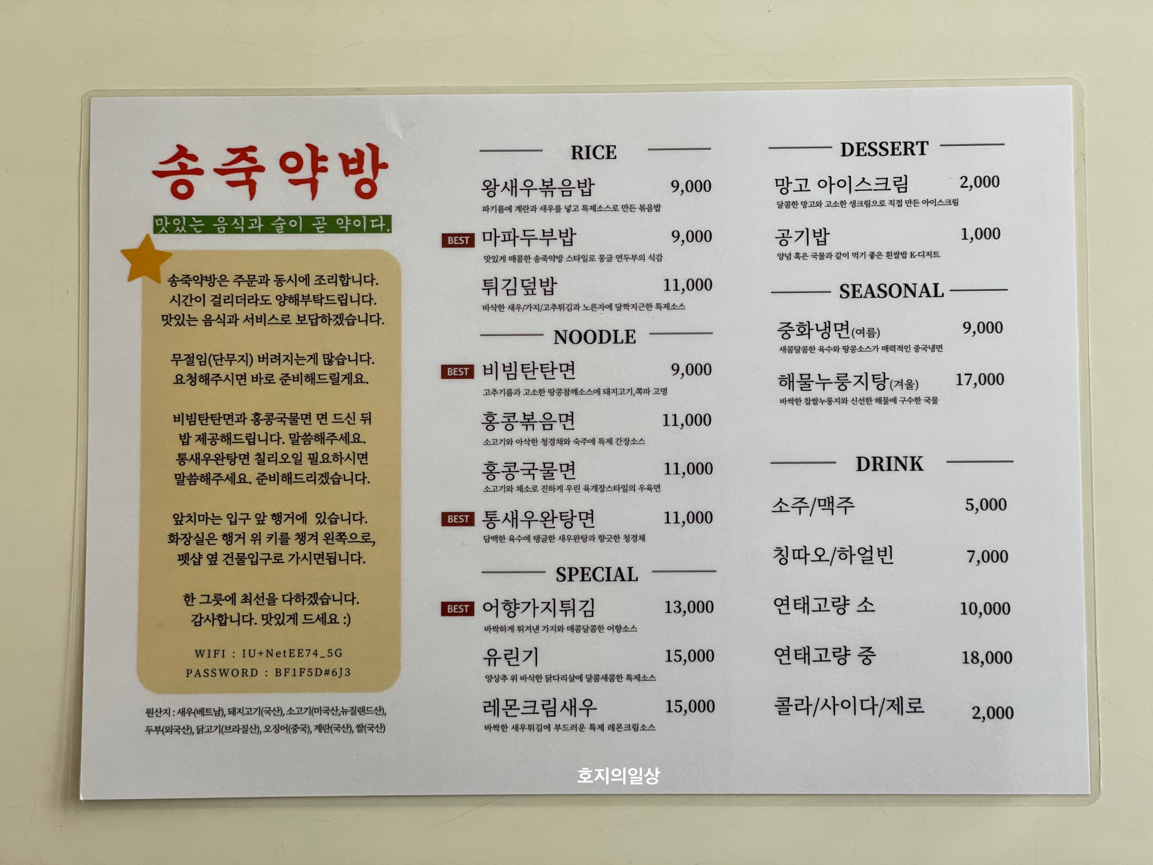 송죽약방의 메뉴 모습이예요😊